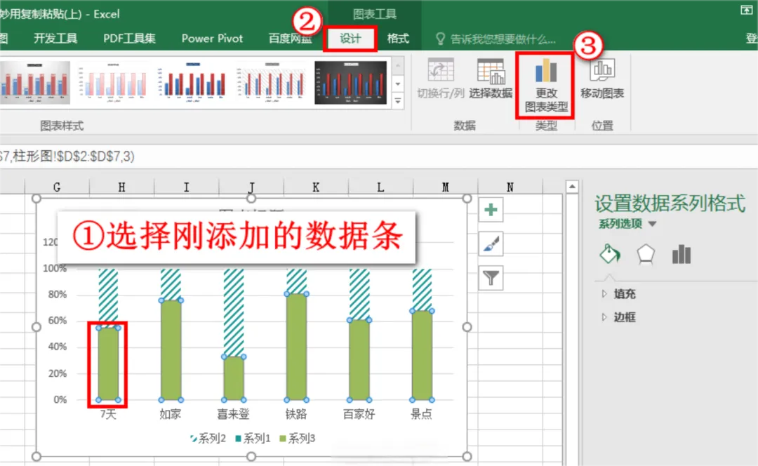 选中“入住率2”数据源区域,即D2:D7,按键盘Ctrl+C复制后,直接点击图表空白区域,选中图表,按键盘Ctrl+V键粘贴,即可快速添加数据源。如下动图,完成粘贴之后,即出现了绿色的系列3:在图表中追加重复数据之后,选中刚添加的入住率2,即系列3的柱子,选择设计选项卡→单击更改图表类型按钮。如下图: