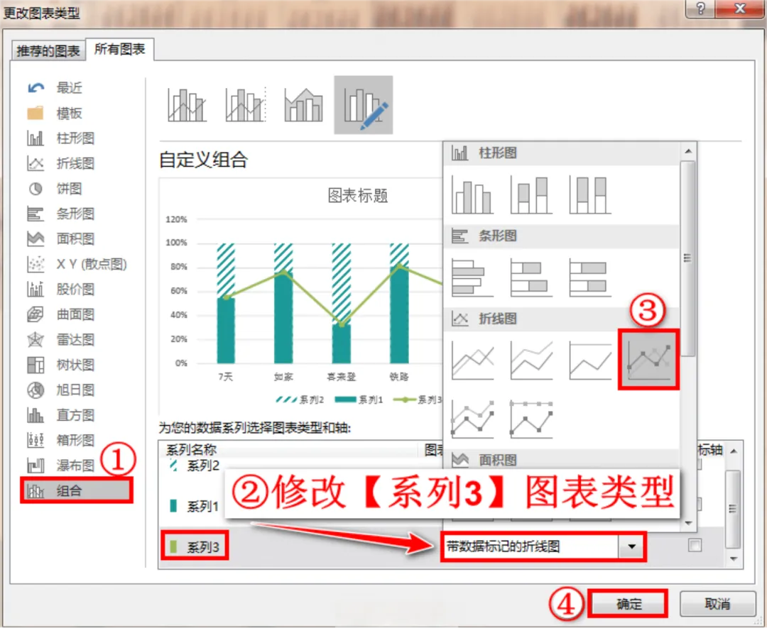 弹出“更改图表类型”对话框,点击左侧的组合→在右侧中,修改系列3的样式为带数据标记的折线图,最后点击确定。如下图: