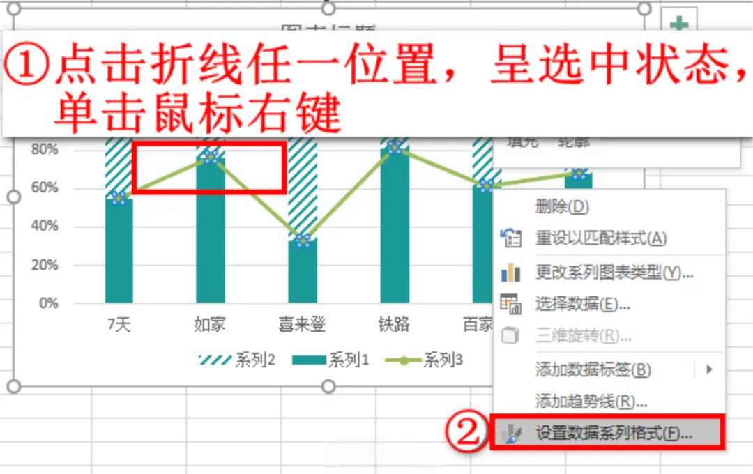 接着我们来更改折线图的样式,点击图表中的折线,单击鼠标右键,在弹出的窗口中,选择设置数据系列格式。如下图: