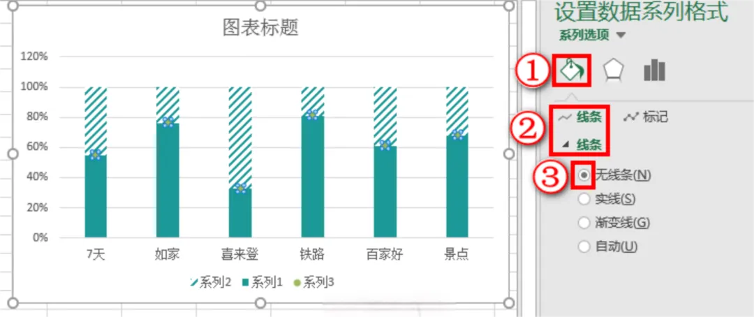 右侧出现设置数据系列格式窗格,点击油漆桶图标,选择填充选项→选择线条页签→勾选线条的类型为无线条。如下图: