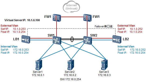 同时用红色、蓝色线条及标注文字区分F5上对内及对外的VLAN,拓扑中只标注相关的信息元素,简洁明了。