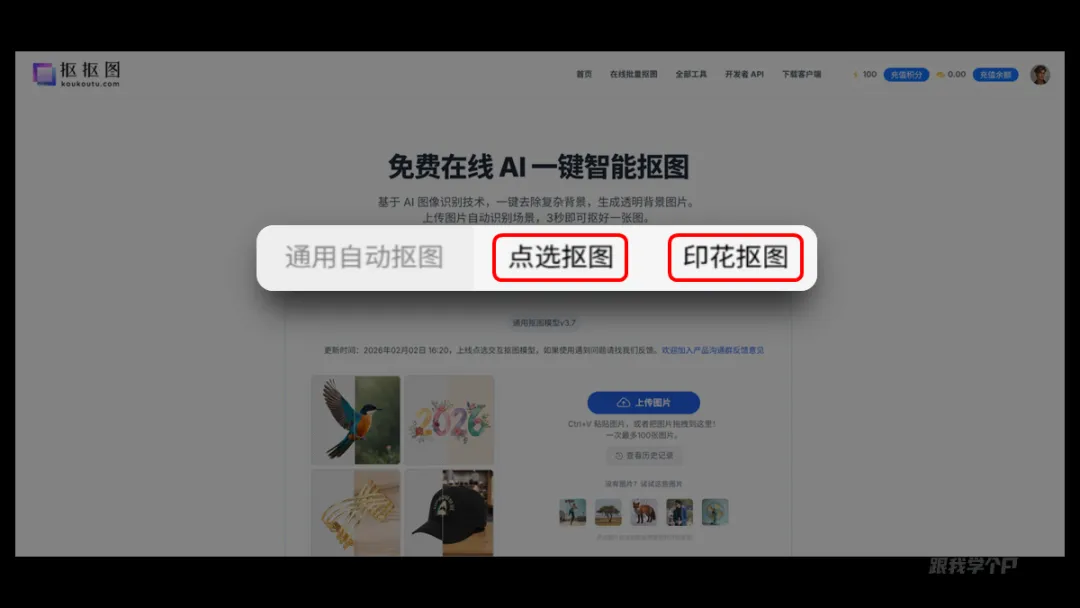 除了【通用抠图】这个模式以外,网站还贴心地提供了另外两个模式,点选抠图、印花抠图。