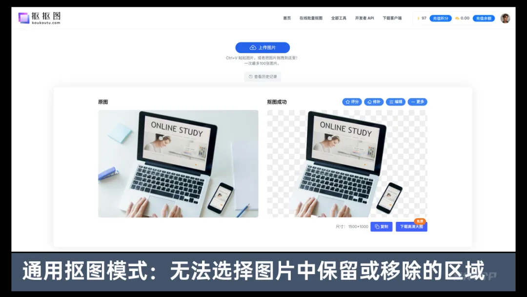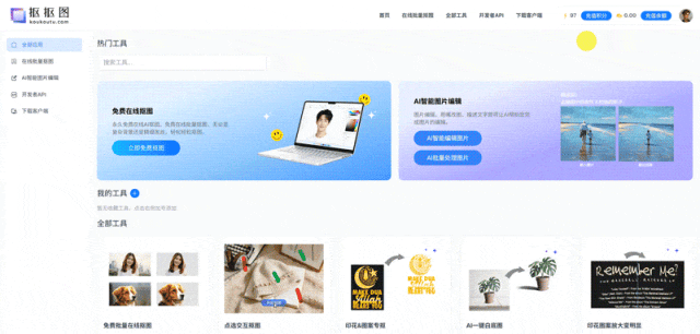 除抠图外,这网站还有其他功能,比如去水印,无损放大,图片置换场景等,大家可按需选择(部分需要积分)。