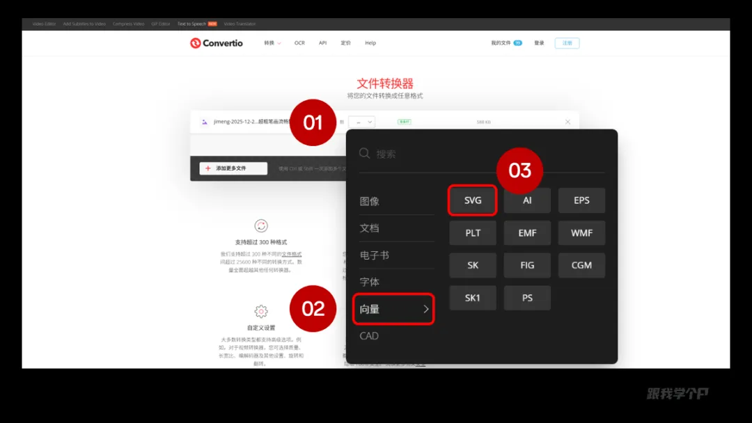 你只需上传png图片,最好是白底黑字,接着在选择窗口中选择【矢量】-【SVG】,点击转换即可。