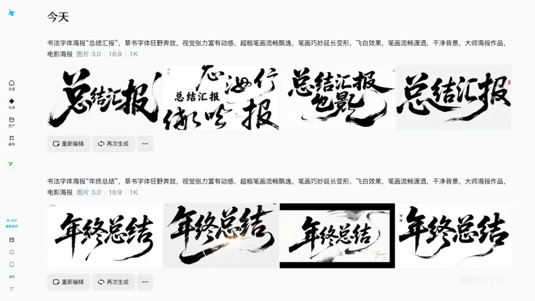 选择其中的关键词,比如“年终总结”,让即梦AI帮我们生成白底黑字的毛笔书法字: