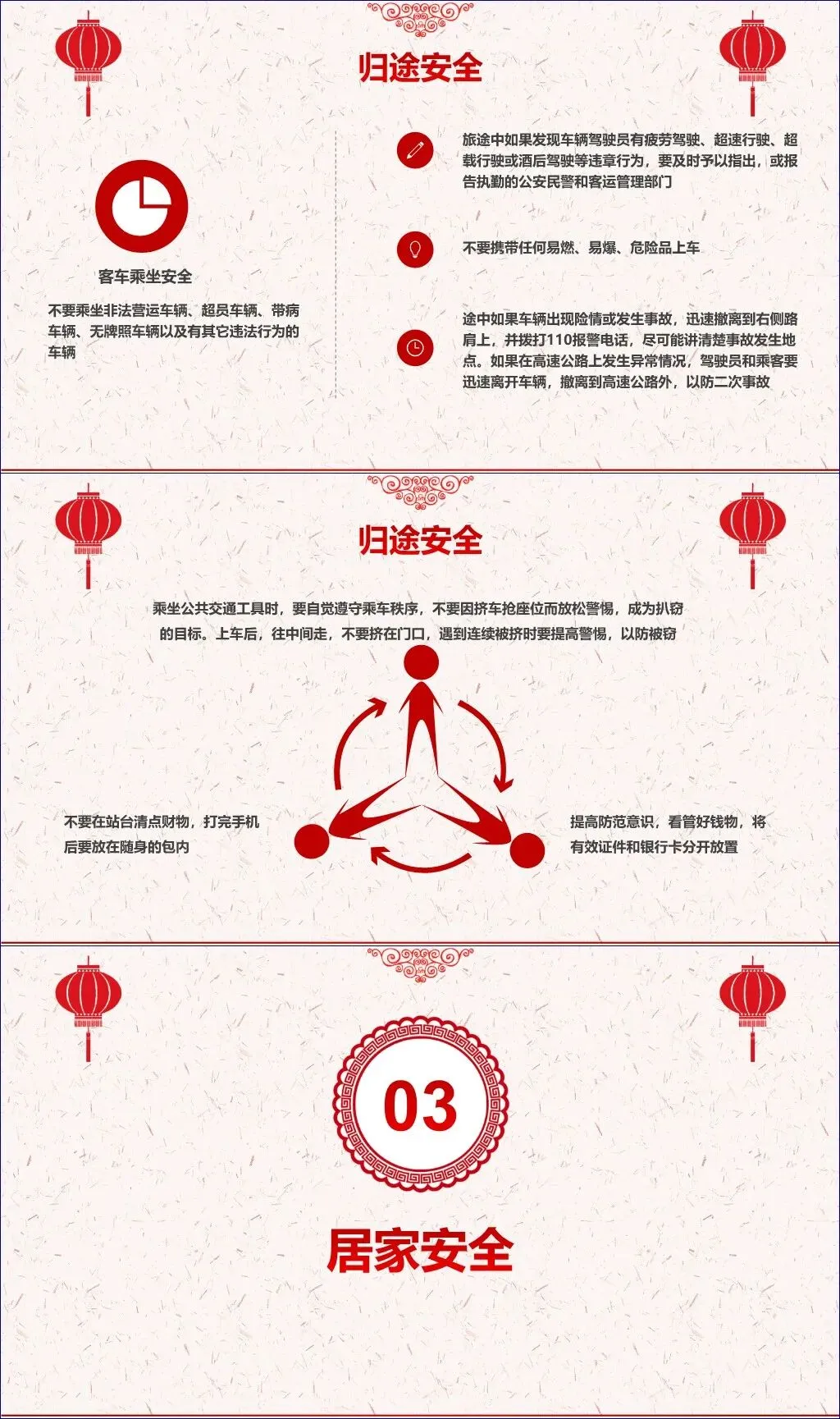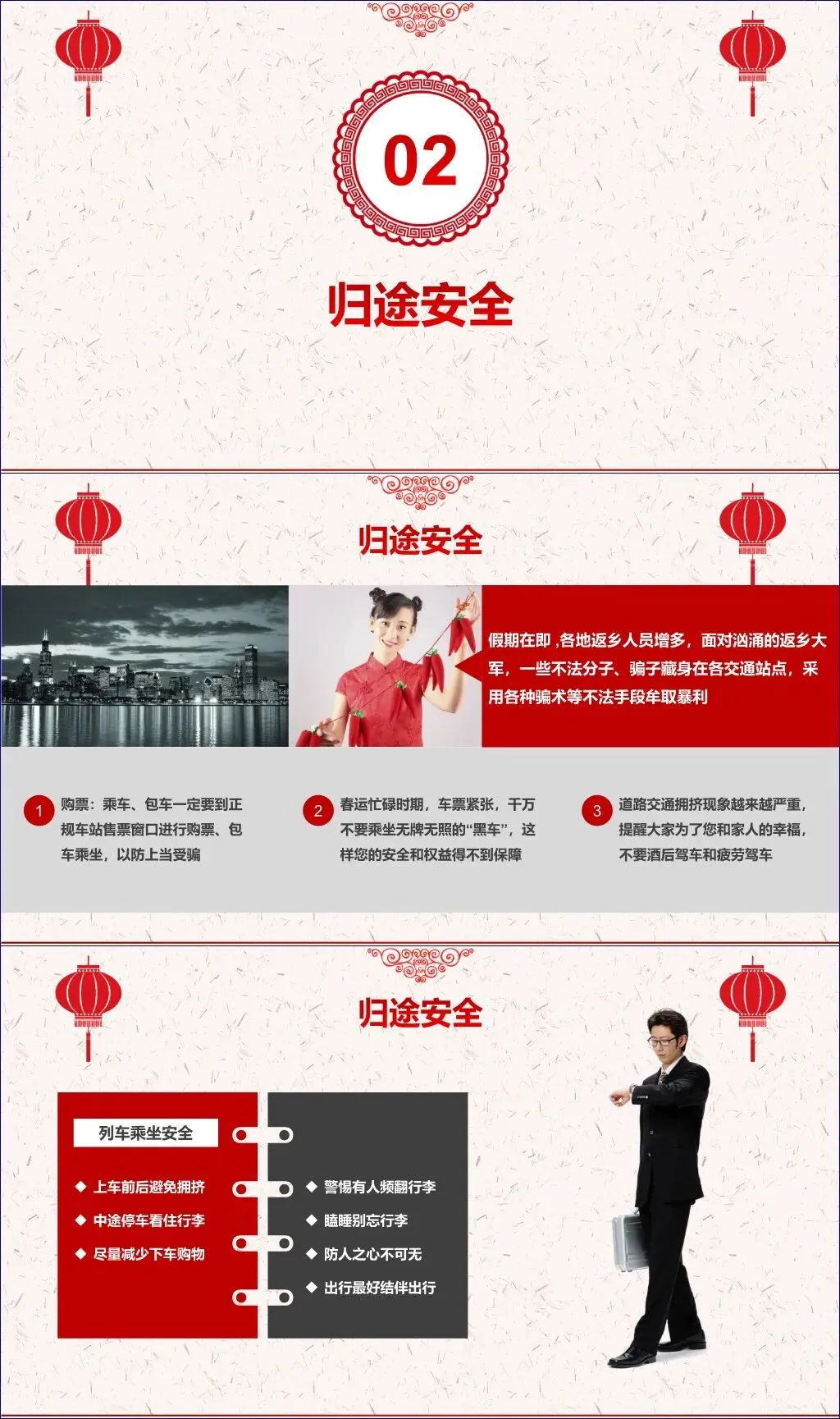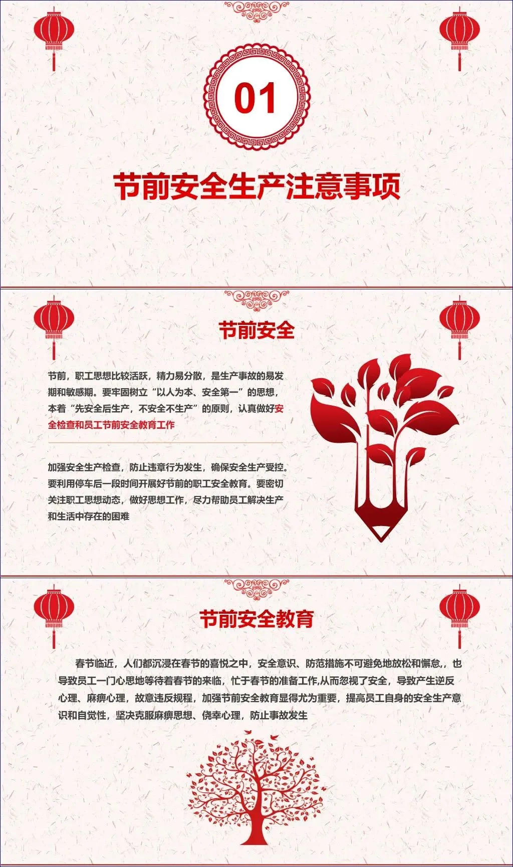 该文档旨在提醒员工及公众在春节前后注意各类安全事项。全文结构清晰,分为五大板块: