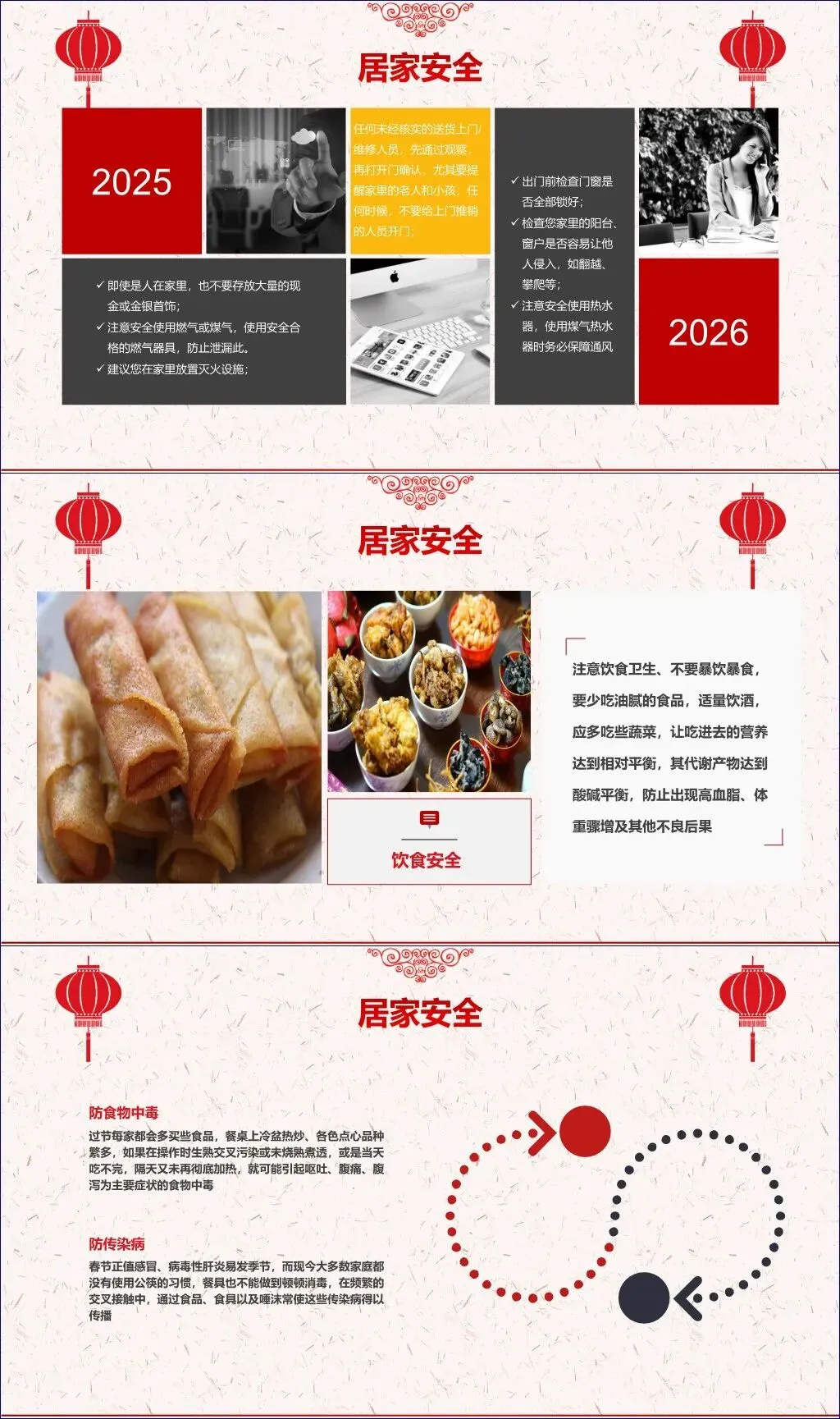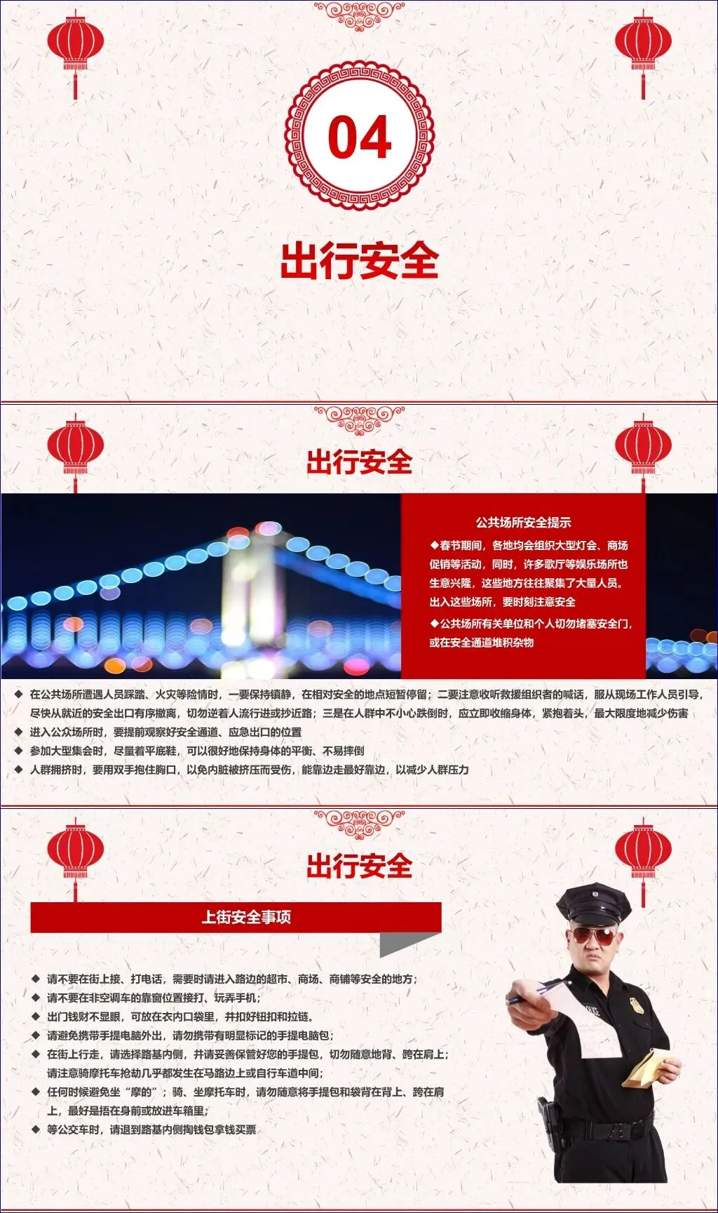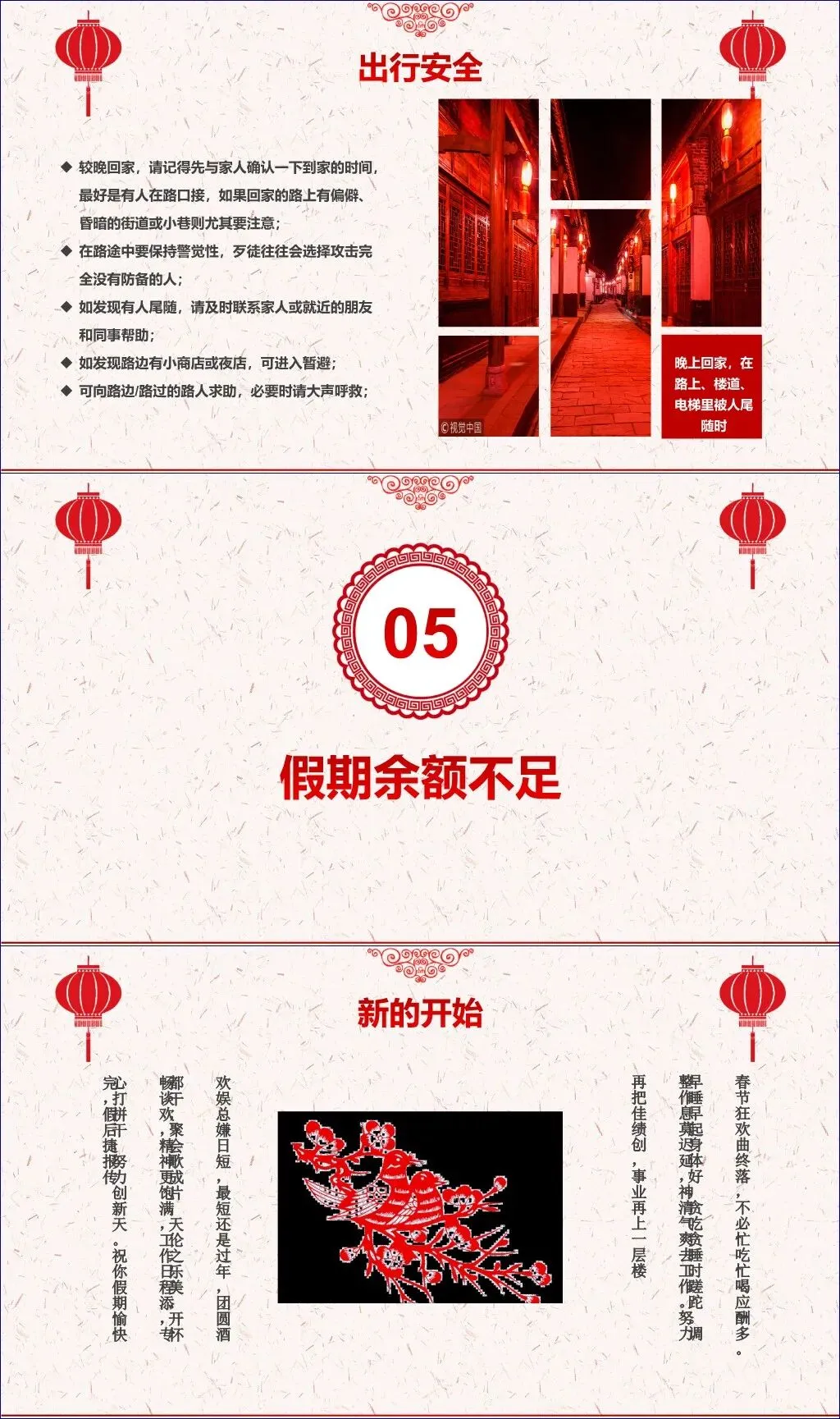 该文档旨在提醒员工及公众在春节前后注意各类安全事项。全文结构清晰,分为五大板块: