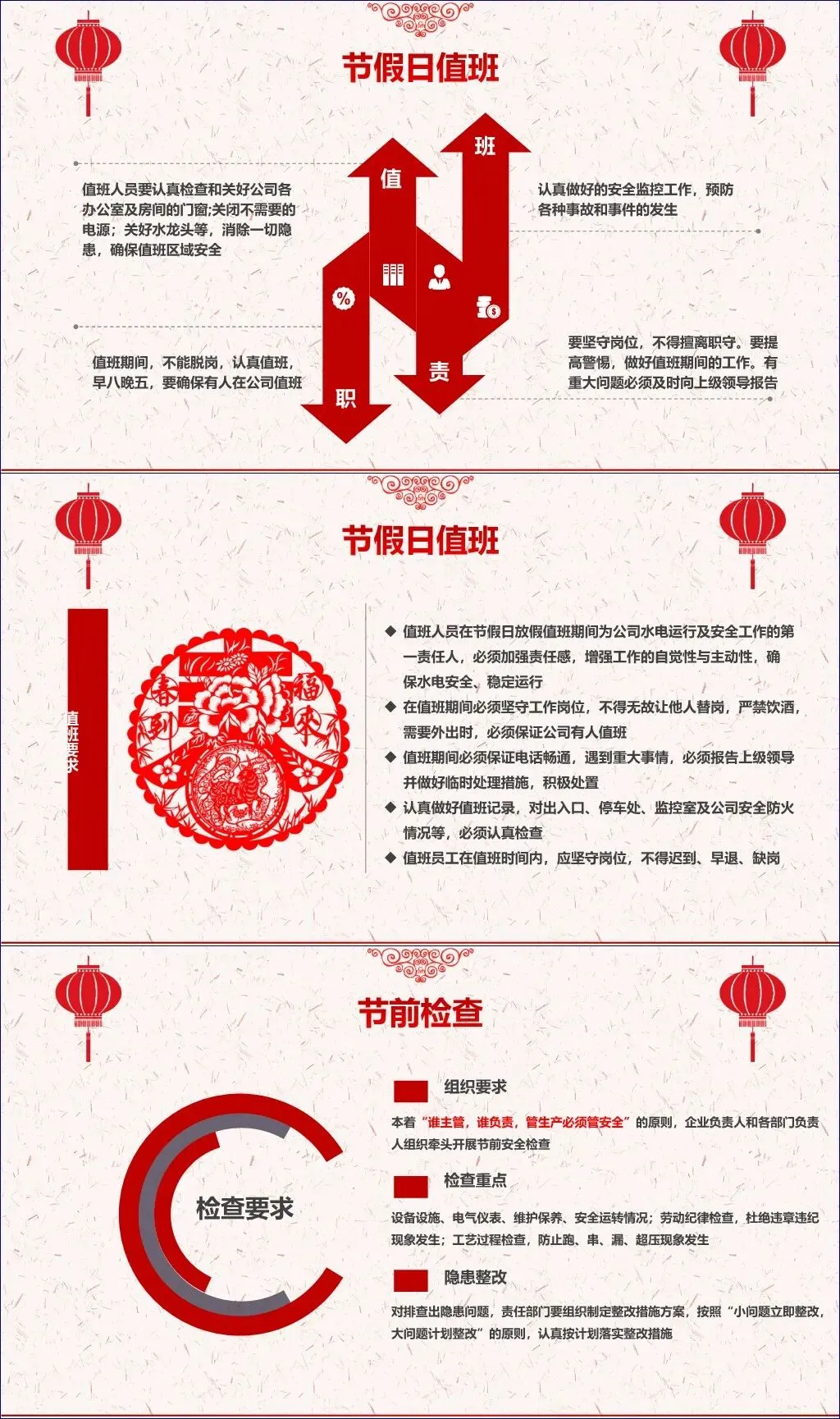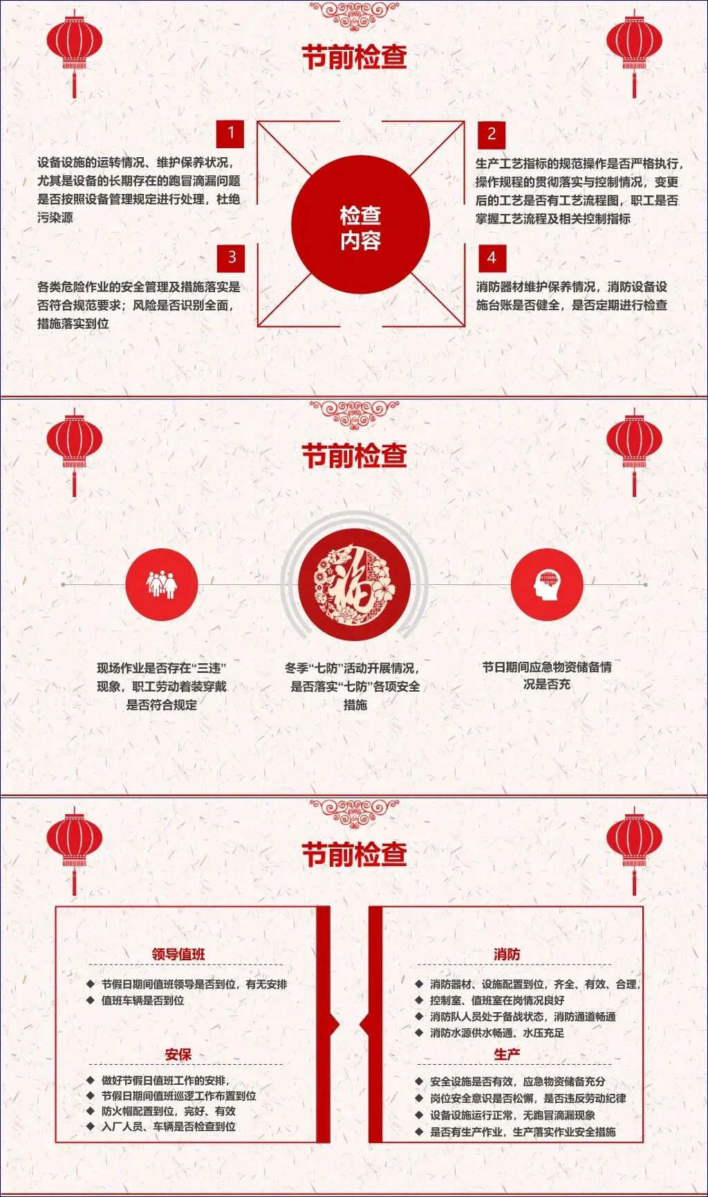 要求开展节前安全检查:包括设备设施、电气仪表、工艺流程、消防器材、危险作业管理等。
