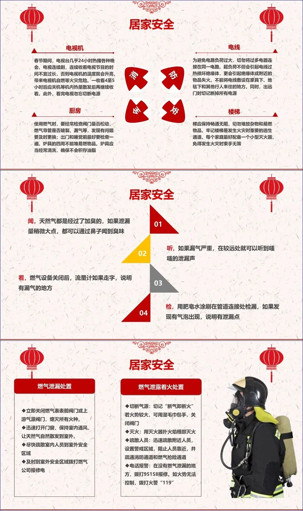 燃气使用安全:定期检查管道、阀门;泄漏时关闭气源、通风、禁用明火,并用肥皂水检漏。