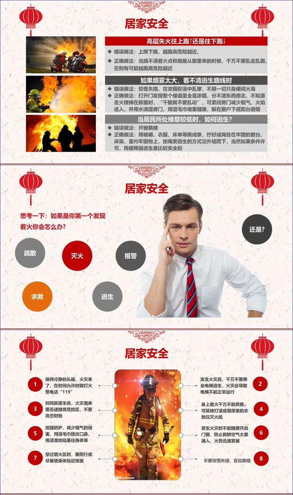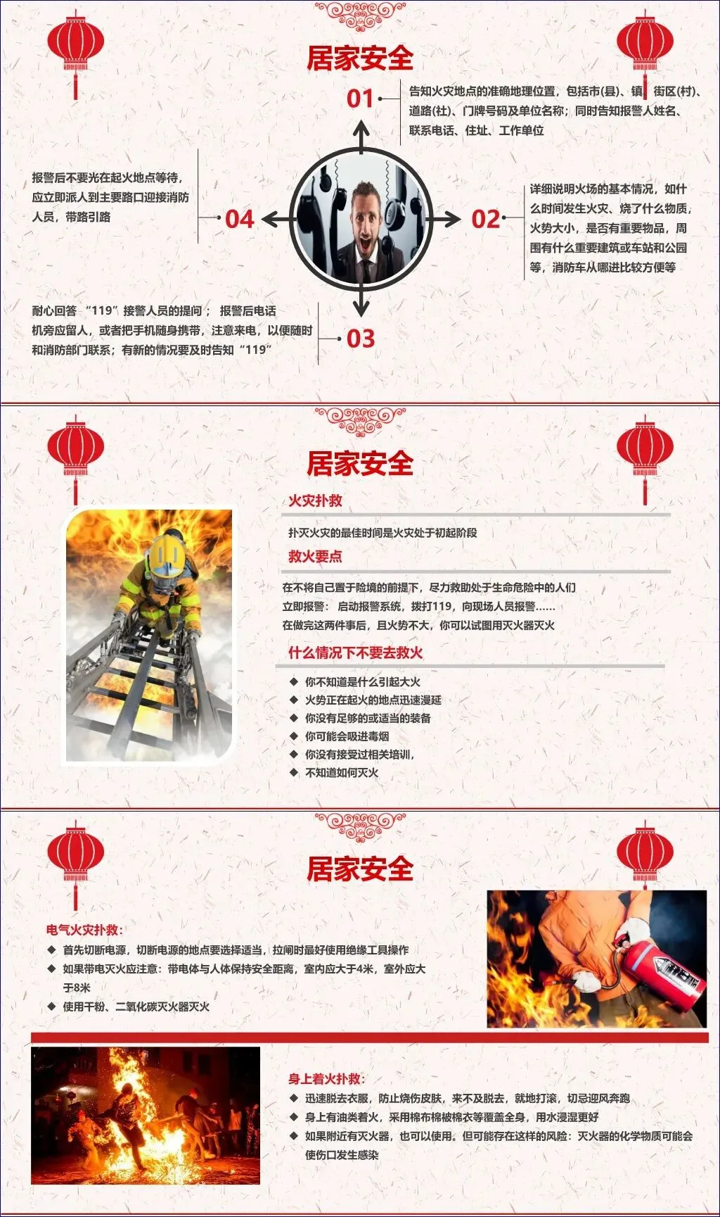 火灾应对:掌握正确逃生方法(勿乘电梯、湿毛巾捂口鼻、低姿匍匐),明确报警要点(地点、火情、联系方式等)。