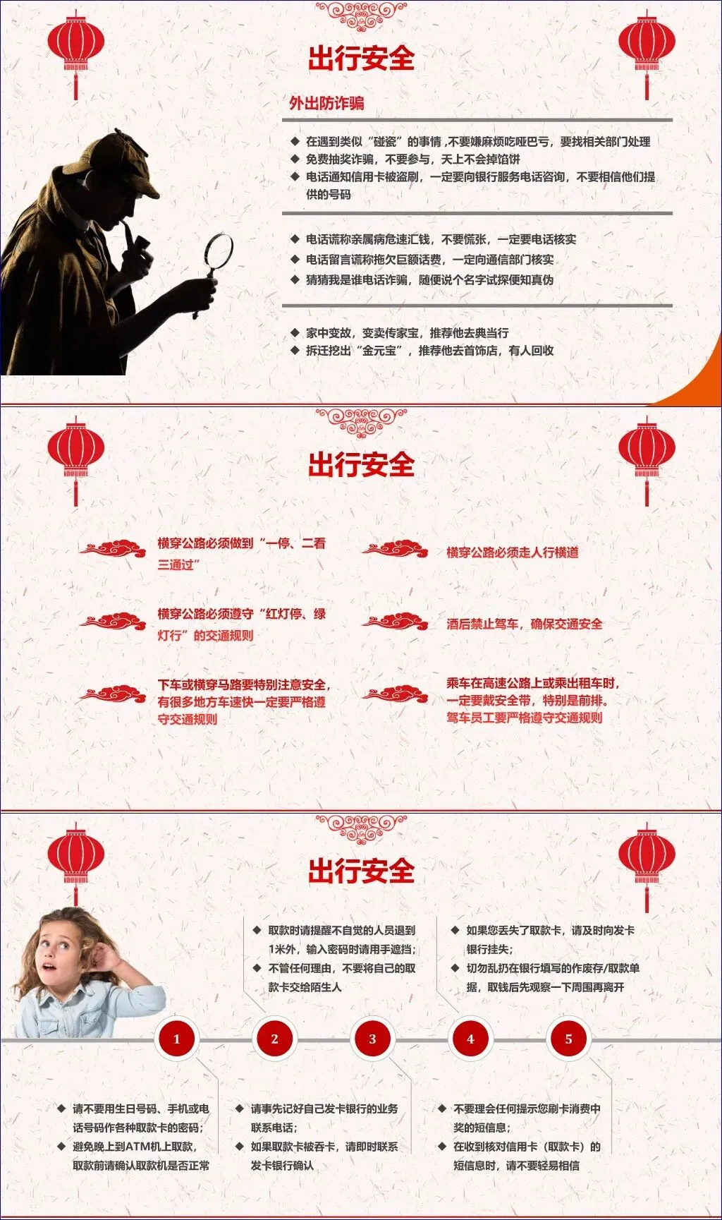 出行防诈骗:警惕“碰瓷”、中奖骗局、冒充亲友求助、假币陷阱等。