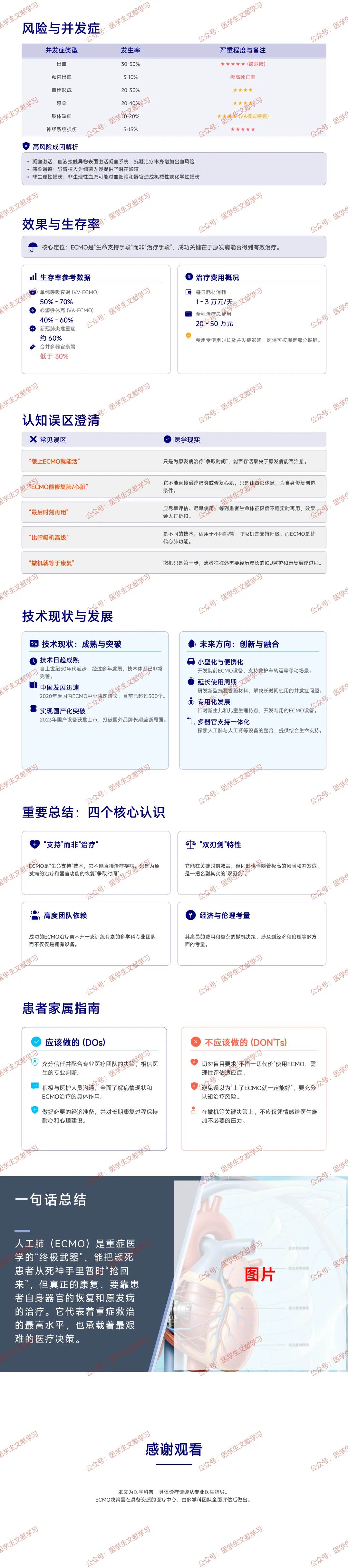 ECMO 是重症救治的 “双刃剑”,核心价值是为危重患者 “抢时间”,但依赖多学科团队、严格适应症评估与并发症防控。其成功关键在于原发病的可逆性与及时治疗,而非设备本身;使用需兼顾医疗效果、经济成本与伦理考量,家属需理性认知风险与预后。
