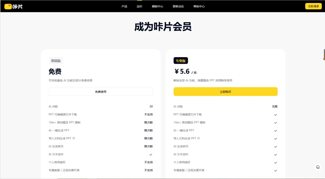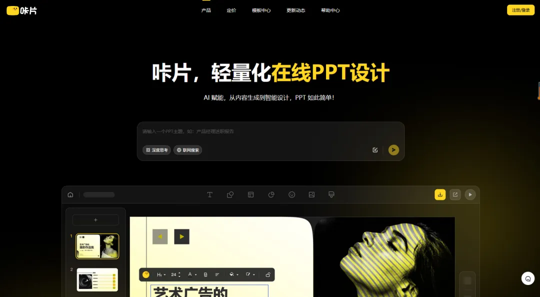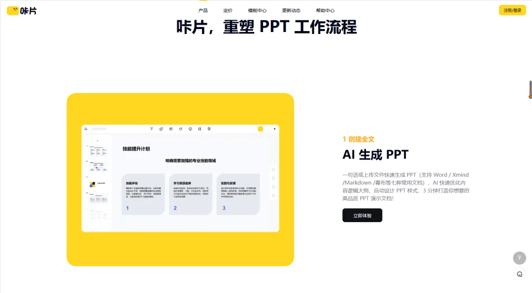 AI一键生成PPT:用户只需输入主题或关键词,咔片能自动生成完整的PPT框架,包括标题页、内容页、结尾页等,提供多种风格和主题的模板,用户可以根据需求选择合适的模板,无需从零开始设计。