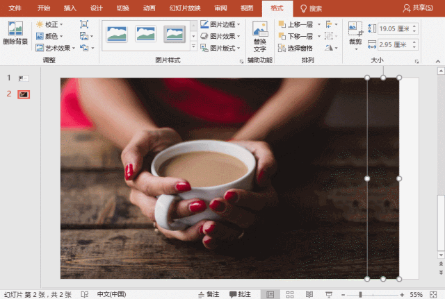 再选择裁剪的方块,点击【图片工具】-【格式】-【排列】-【旋转】-【水平翻转】。最后拖动方块调整宽度,这样图片即可在不变形的情况下,填满背景且无缝链接,非常自然。