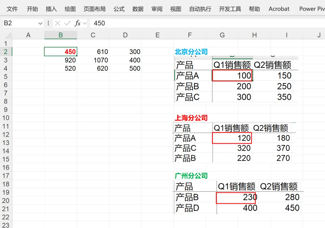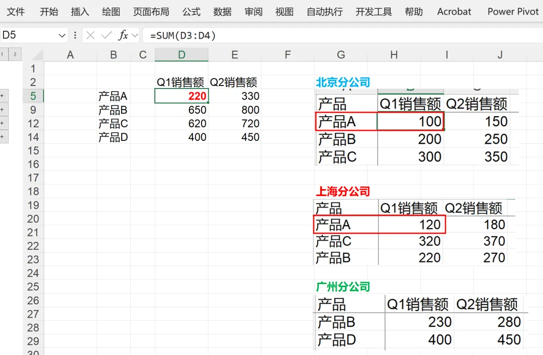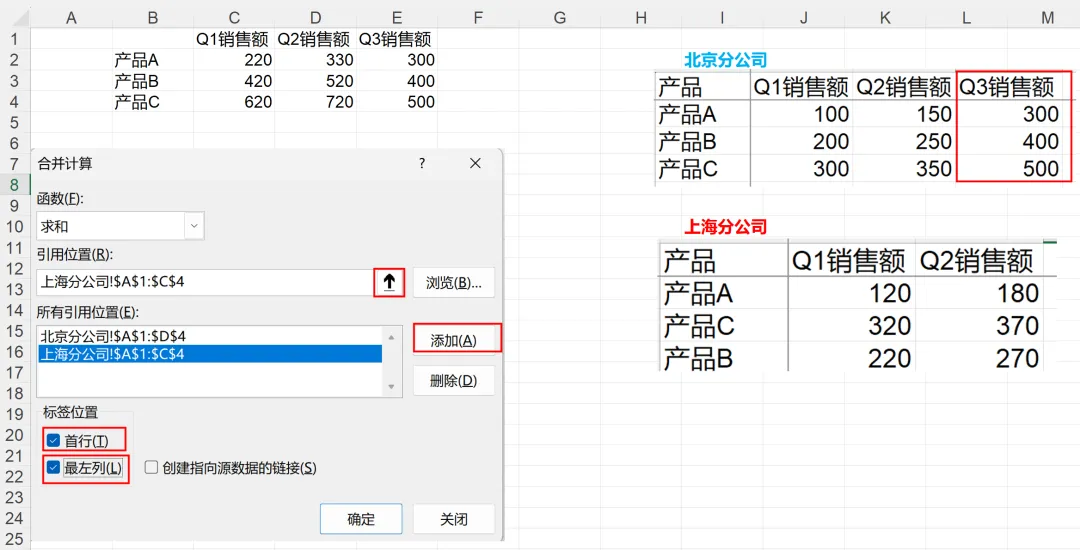 上面案例当中,每个分表的列数(都只有“Q1销售数据”和“Q2销售数据”)是相同的,如果不同呢?也是可以合并的,如下所示,北京分公司有三列数据,上海分公司只有两列数据,合并之后变动了三列,相同产品,相同季度的合并在一起,还是非常方便的,也不用写任何公式。