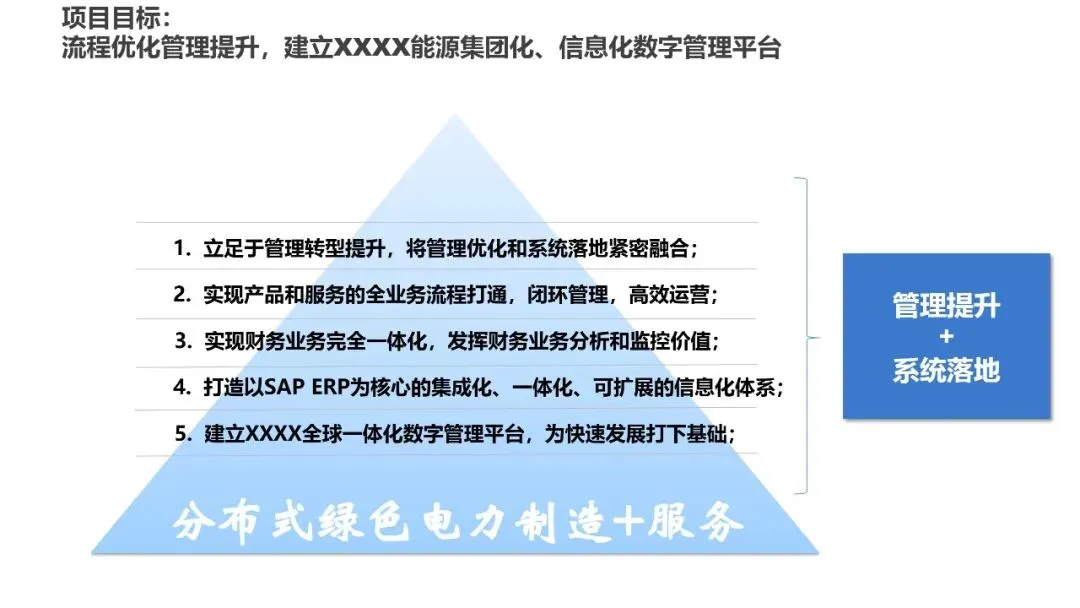 该项目立足于管理转型提升,将管理优化和系统落地紧密融合。核心目标包括:实现产品和服务的全业务流程打通,完成财务业务一体化,打造以SAP ERP为核心的集成化体系,最终建立全球一体化数字管理平台。