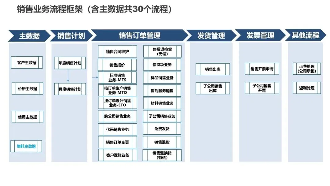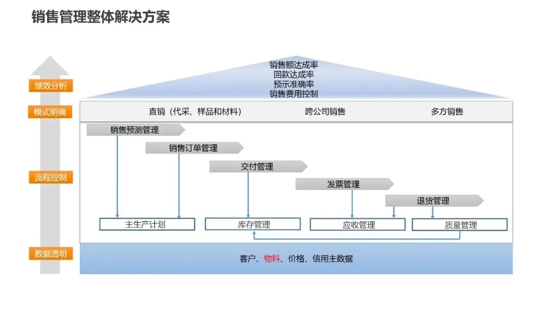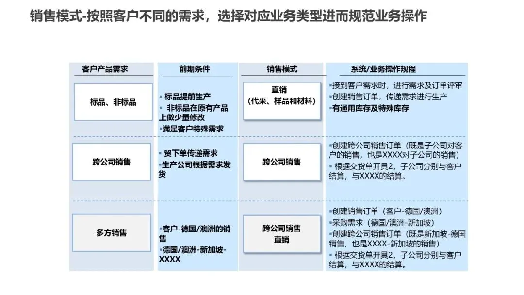 销售模块设计了30个业务流程,建立了完整的销售管理体系。根据客户不同需求,制定了直销、跨公司销售、多方销售等不同销售模式的操作规范。