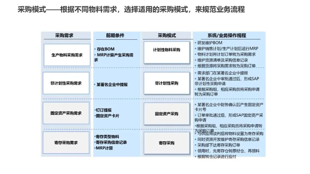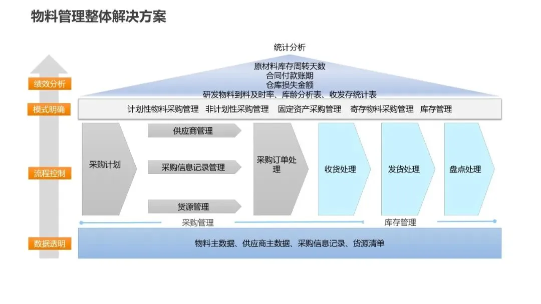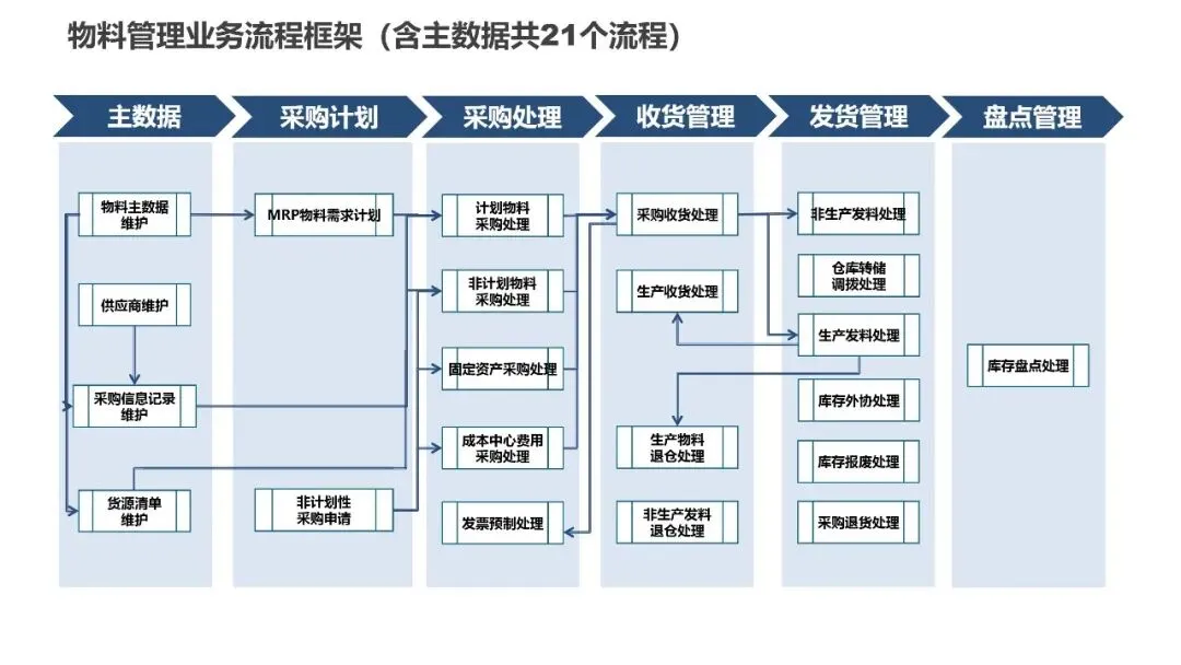 物料管理模块的21个流程建立了完整的供应商管理和采购体系。通过物料主数据标准化,实现“一物一码”,为精细化管理奠定基础。