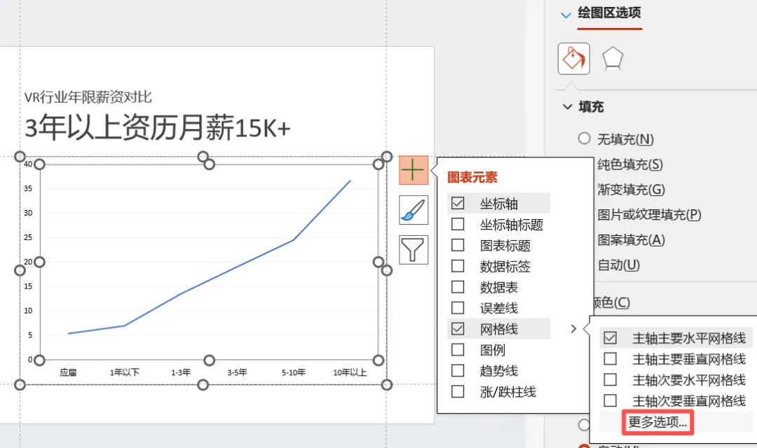 第四步,突出3年以上资历月薪15k+这个论点,对折线节点进行不同的颜色填充。