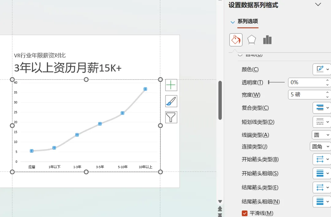 选中折线→填充颜色调整为白2→宽度5磅→勾选平滑线;