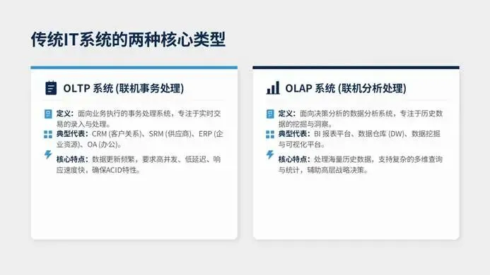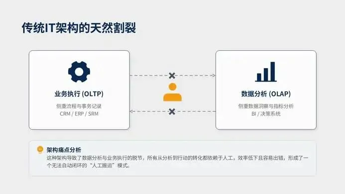 这,就是我们传统IT架构下,数据分析(OLAP)与业务执行(OLTP)“天然割裂”运行带来的巨大痛点。