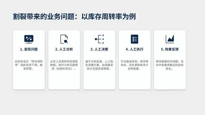 数据和业务仿佛两条平行线,永远无法交汇,所有从洞察到行动的转化,都必须依赖“人肉翻译”和“手动追溯”,形成了一个巨大的效率黑洞。