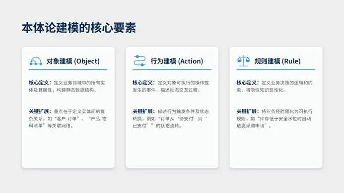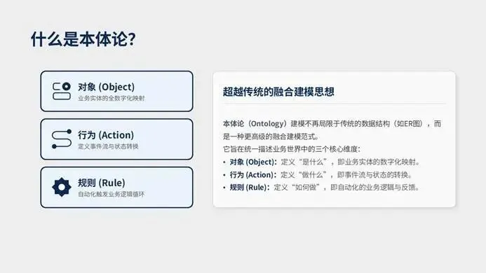 简单来说,本体论让计算机不仅能“存储”和“计算”数据,更能“理解”业务。它为机器构建了一个完整的、可执行的业务知识图谱。