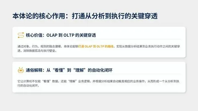 当系统具备了这种“理解能力”,神奇的事情就发生了。它能真正打通从数据分析(OLAP)到业务执行(OLTP)的“任督二脉”,实现从洞察到行动的自动化闭环。
