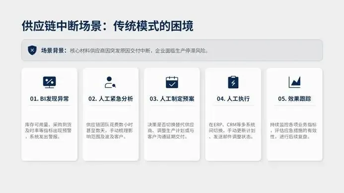 自动决策:触发预设的业务规则,自动计算出最优解决方案,比如:切换至备选供应商B、调整生产计划、并自动计算出对客户交付的影响。