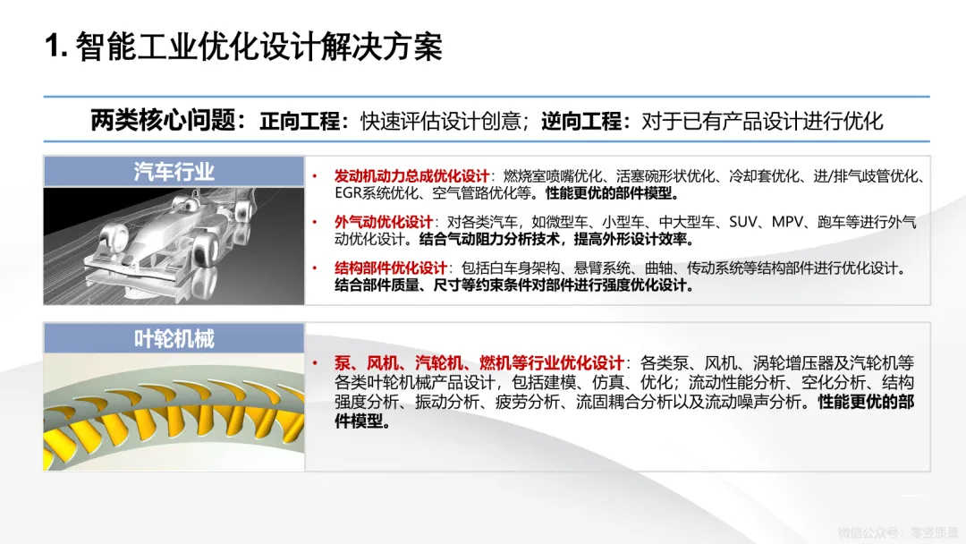聚焦工业优化设计,针对正向工程(快速评估设计创意)和逆向工程(优化已有产品设计)两类核心问题,为汽车、航空航天、船舶海工、叶轮机械等行业提供定制化解决方案。包括发动机部件、飞行器外气动、船舶线型等关键产品的建模、仿真与优化,通过专业平台和软件工具,缩短设计周期,提升产品性能。