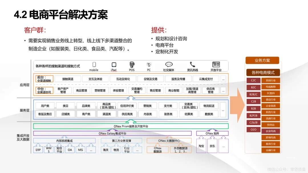 包含数字化营销、电商平台搭建、大数据舆情分析三大方向。通过打通全域销售数据,构建客户画像,实现潜客挖掘、精准营销及维修保养回站预测;支持多类型电商模式转型,整合线上线下渠道;依托全网舆情监测,分析产品口碑、竞品动态及市场趋势,为销售决策提供数据支撑。