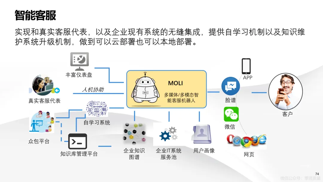 核心为智能客服系统,实现人机协同服务,集成自学习机制与知识库管理,支持多渠道部署,高效响应客户咨询与问题处理。同时,方案注重服务流程数字化与知识沉淀,助力企业提升客户粘性与服务效率。