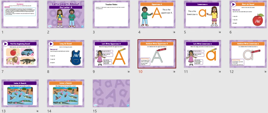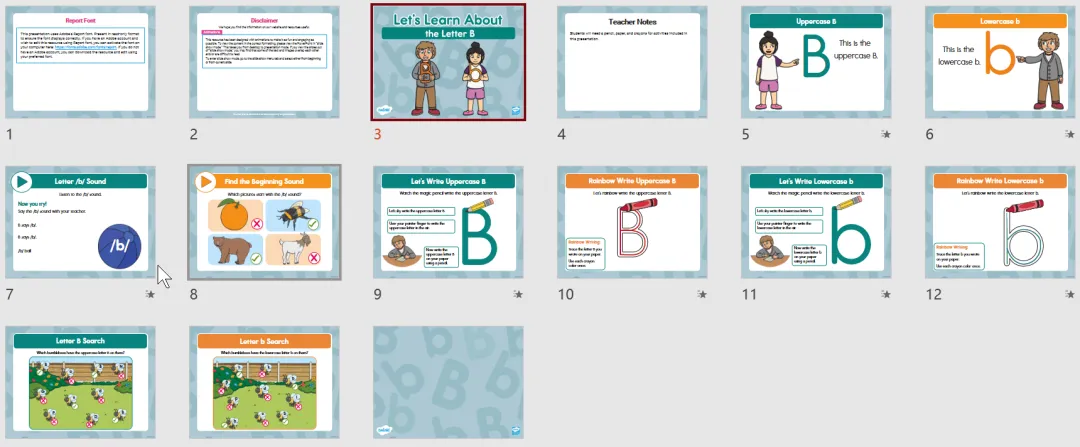 今天给大家分享一套英文26个字母的PPT课件,出自英国鼎鼎大名的教育平台Twinkl。它家出品皆是精品。每个字母包含大小写字母辨认、发音、书写、小游戏互动等,是拿来就能用的课堂绝佳帮手每个字母的课件设计都很丰富,这里仅展示A和B的课件部分内容: 打印界的性价比之王!黑彩同价5分钱一页,满2.9元顺丰包邮