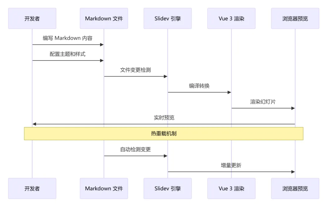这样的简洁语法,让开发者可以将精力集中在内容创作上,而不是排版。### 🧑💻 开发者友好的功能#### 代码高亮与实时编码Slidev 内置了 Shiki 和 Monaco Editor,提供一流的代码片段支持:```mermaidgraph LRA[代码输入] --> B[Shiki 高亮]A --> C[Monaco 编辑器]B --> D[精美展示]C --> E[实时编辑]E --> F[代码演示]style A fill:#646cff,color:#fffstyle B fill:#42b883,color:#fffstyle C fill:#42b883,color:#fff