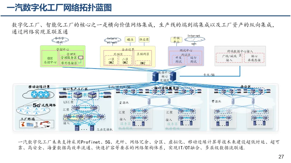 同时,这种协同能力还体现在跨部门、跨层级的数据流通上。一汽数字化工厂通过 Profinet、5G、光纤等技术搭建超低时延、超可靠的网络架构体系,实现 IT/OT 融合、多层级数据流联通。从长春数据中心到天津数据中心的 5G 数据传输试点,到车间内 5G 设备的互联互通,数据的高效流通让工厂管理层能实时掌握生产现场的每一个环节:从物料的入库、上线,到车辆的生产进度、质量检测数据,都能在系统中实时呈现,订单交付周期从 29 天缩短至 23 天,订单及时满足率达到 100%。