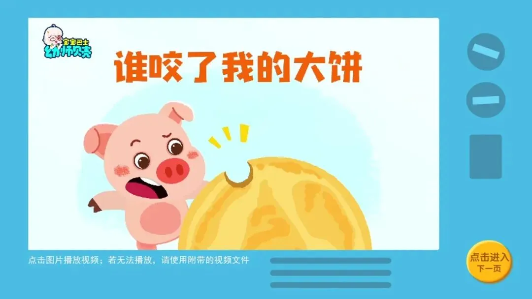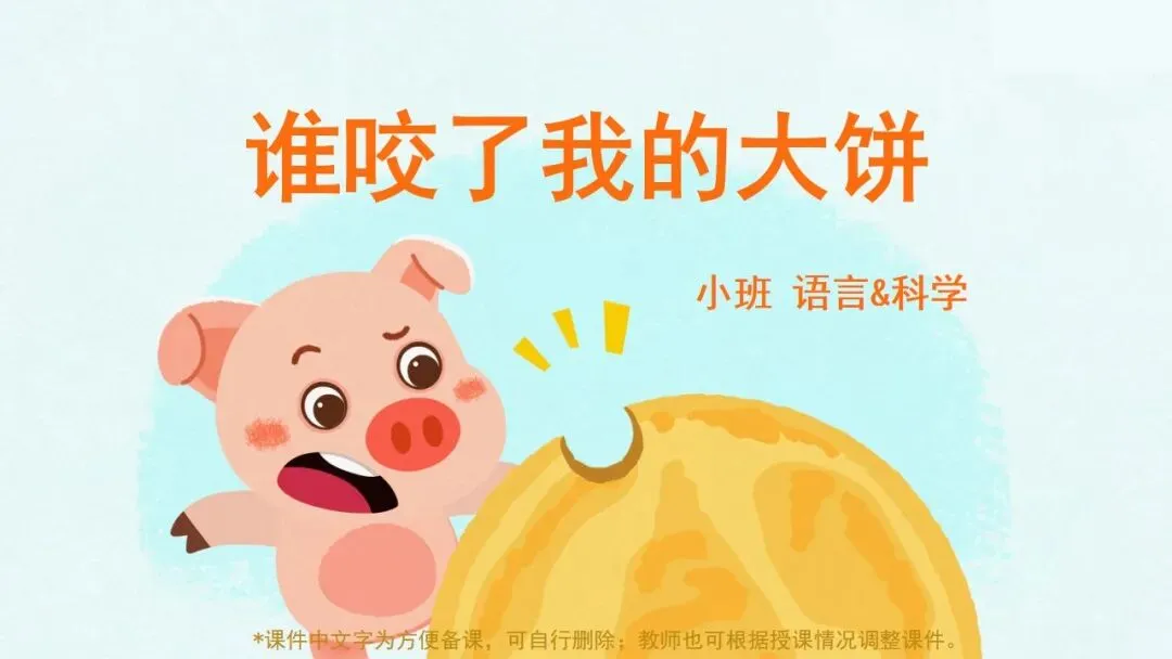 师:今天,老师给小朋友们带来了一个好听的绘本故事,故事名字叫《谁咬了我的大饼》。