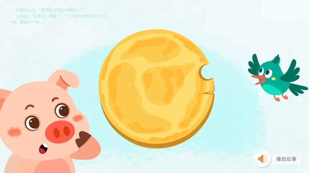 幼:问小鸟。小猪说:“小鸟,是你咬了我的大饼吗?”