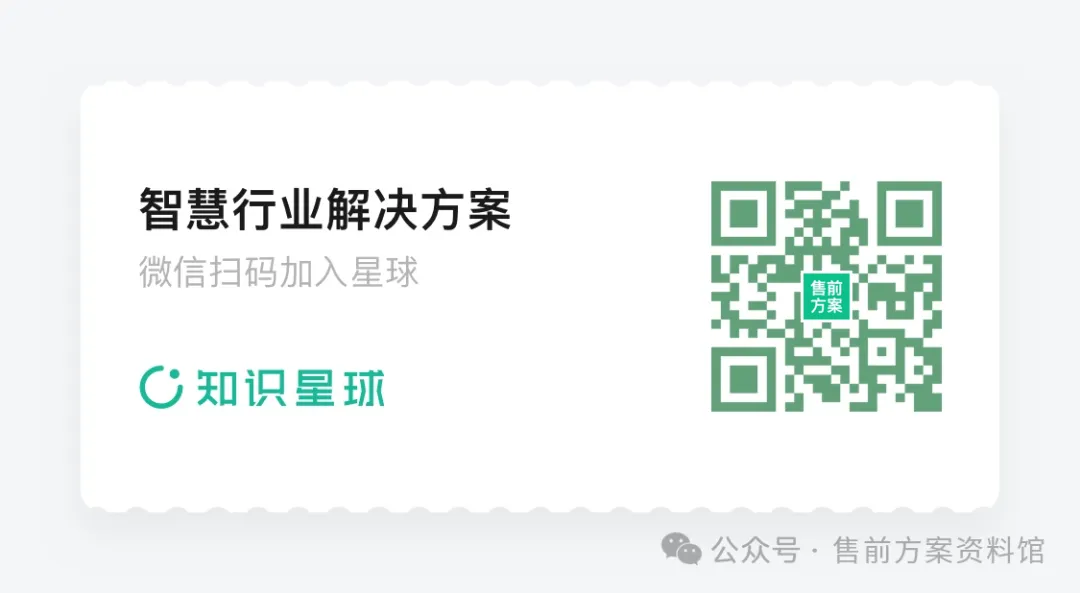【智慧行业解决方案】知识星球,涵盖了上百个行业的高质量解决方案,内容包括智慧医院、智慧医疗、远程医疗、智慧养老、电子病历、健康小屋、医院数据中心、数字化手术室、智慧校园、智慧工厂、智慧仓储、智能制造MES、大数据、时空大数据、数据中心、数据治理、数字孪生、大数据可视化、数据中台、智慧监控、智慧交通、智慧园区、智慧社区、智慧景区、智慧水务、智慧城市、智慧博物馆、智慧物业、智慧银行、智慧楼宇、智慧工地、智慧消防、智慧环保、智慧环卫、智慧公安、智慧办公、智慧教室、智慧港口、智慧BIM、智慧实验室、智慧小镇、智慧路灯、智能井盖、智慧气象、智慧政务、智慧物流、智慧海关、智慧机关、智慧零售、智慧法院、智慧检察院、智慧司法、智慧执法、智慧教育云平台、智能电网、智慧民政、智慧城管、智慧市政、智慧高速公路、智慧防汛、智慧课堂、智慧酒店、智慧机场、智慧餐饮、智慧水厂、智慧财务、智慧粮库、智慧化工园区、智慧矿山、智慧电梯、智慧物流园区、智慧公交、智慧图书馆、智慧海绵城市、智慧能源、智慧油田、智慧供应链、智慧会议、智慧燃气、智慧安防、智慧家庭、智慧安监、智慧商圈、智能客服、智慧管廊、智慧应急、智慧灾备、工业互联网、区块链、车联网、NB-IoT物联网、信息安全、智慧网络、智慧运维、智慧AI外呼、智慧农业、智能充电桩、VR虚拟现实、人工智能、AI用户画像、AI知识图谱、AI人脸识别、数字乡村、智能门锁、超融合、电商、桌面云、城市大脑、私有云、电子班牌、WIFI6、名厨亮灶、量子计算、数字化营销、雪亮工程、无人机、室内定位、DevOps自动化、数字化转型、融媒体、热成像、SCADA系统、微服务、混合云、PLC系统、边缘计算、5G技术、等保2.0、两客一危、疫情防控、防高空抛物、CIM城市信息模型、智慧停车、CRM系统、智慧监狱、食药监管、智慧养猪、智慧门禁、数据埋点、PLM产品生命周期管理系统、ERP系统、OMS订单管理系统、智能家居、6G技术、智慧展厅、智慧党建、智慧林业等领域的解决方案、建设方案、技术方案、投标书等资料。