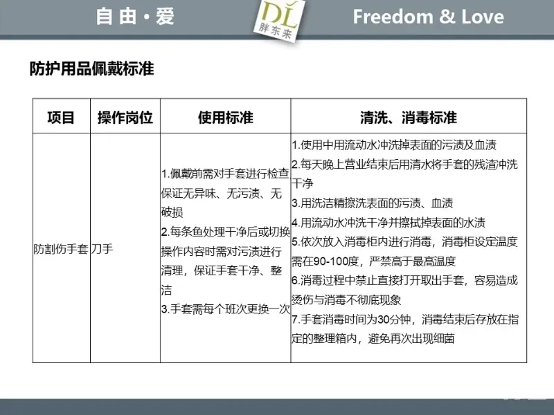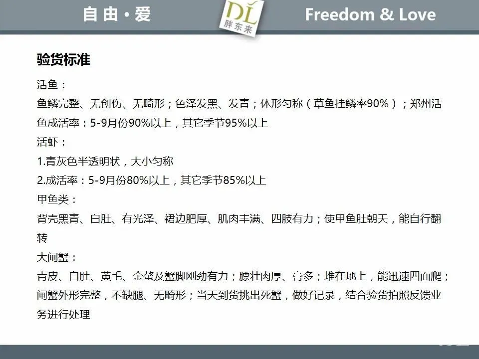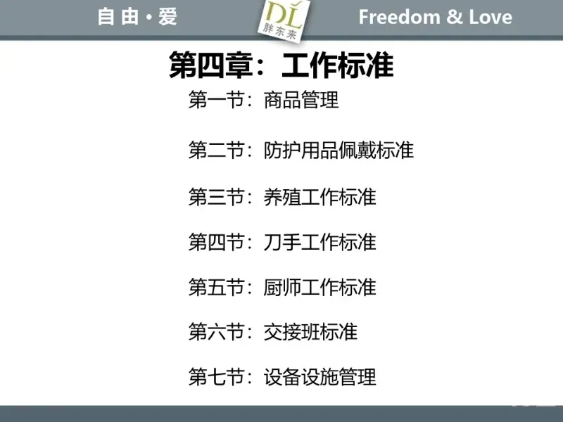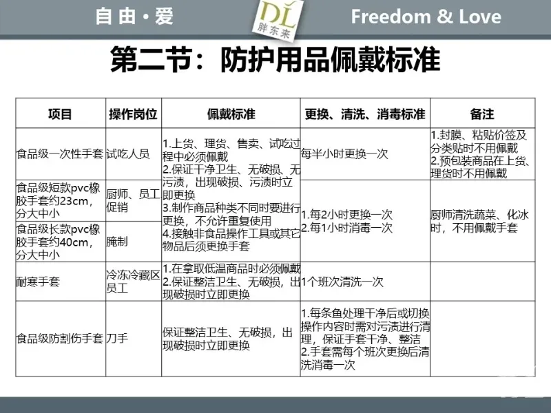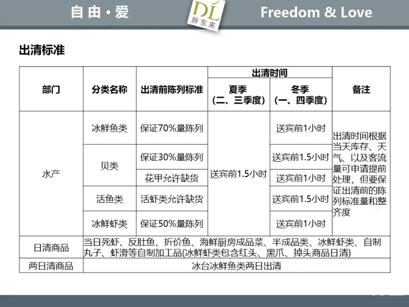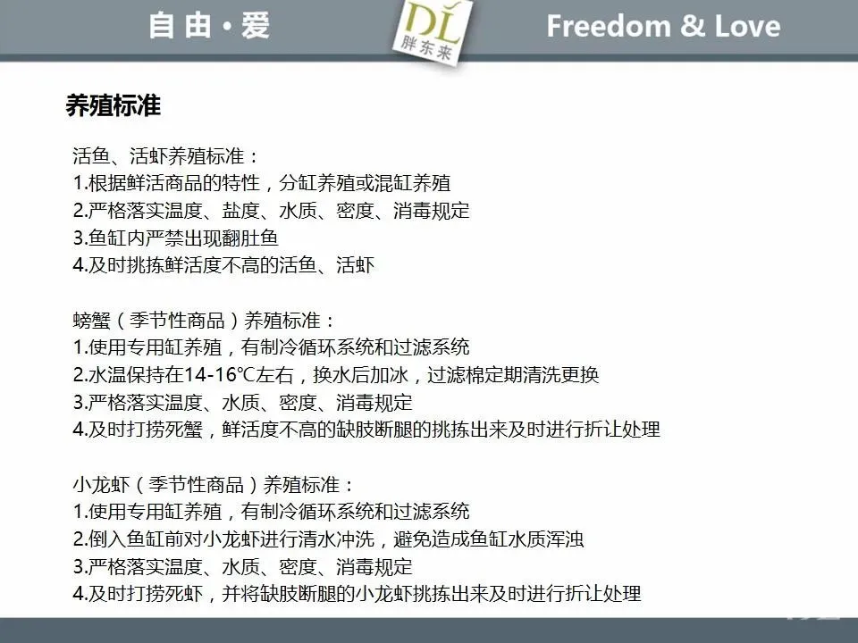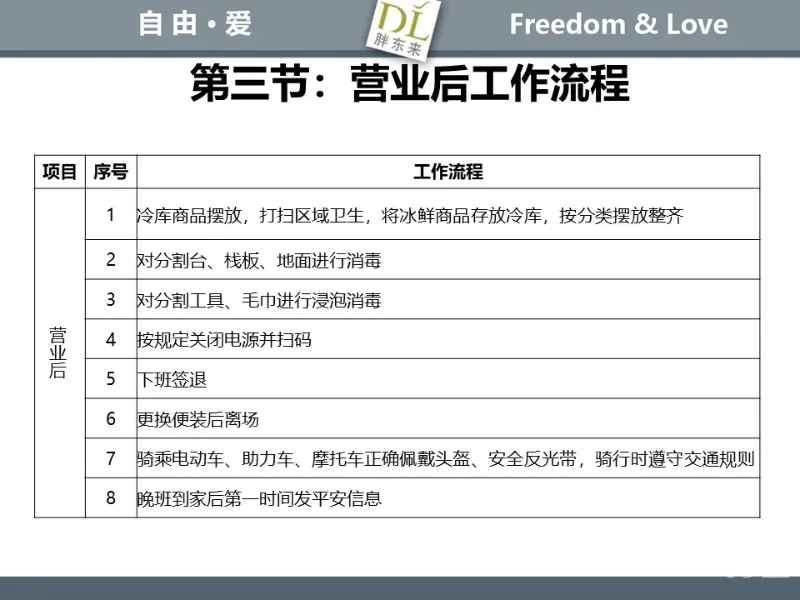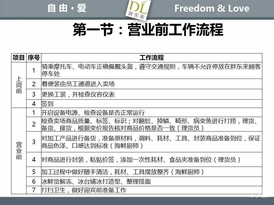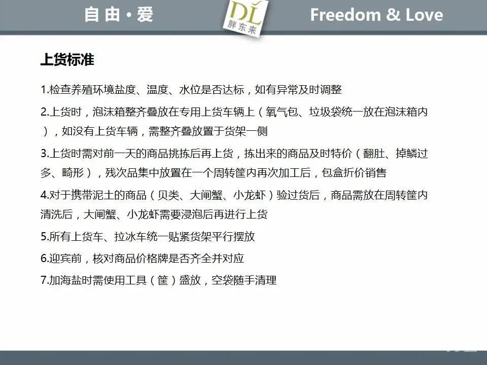 胖东来生鲜营运现场标准内容,将从文将从生鲜营运一天的工作流程包括营业前、营业中和营业后、生鲜的各类标准包括商品管理、防护用品佩戴标准、养殖标准、刀手工作标准、厨师工作标准、交接班标准、设施设备管理标准以及环境标准、卫生标准等多角度分享胖东来生鲜现场的管理培训标准课件。
