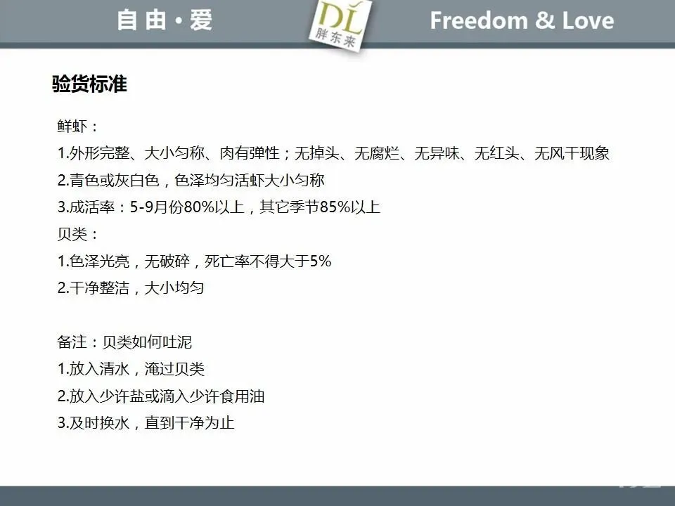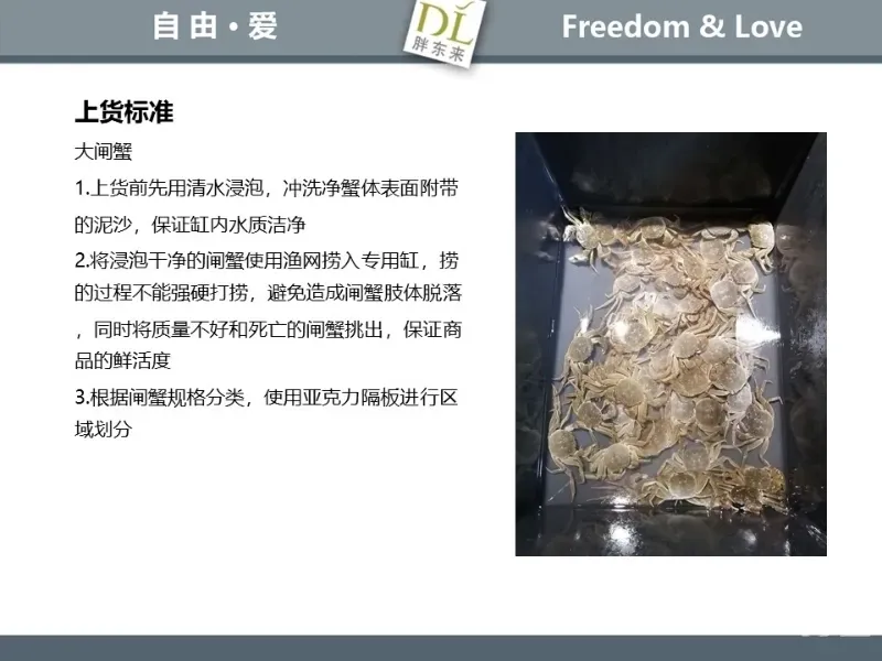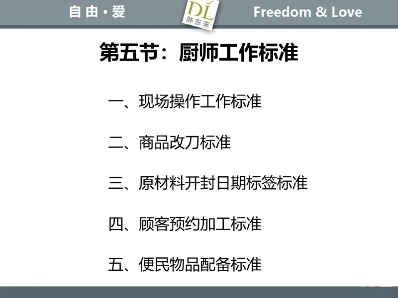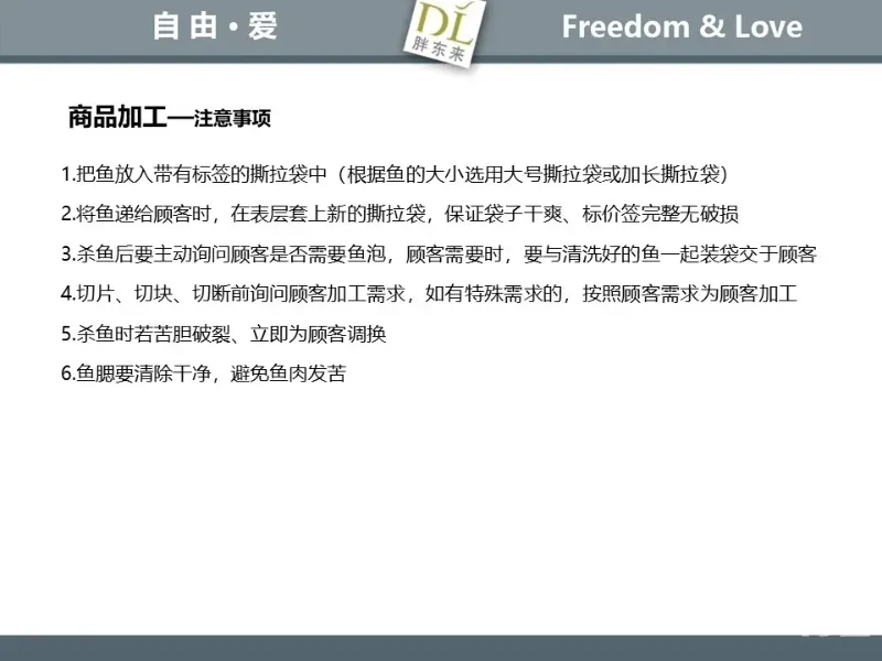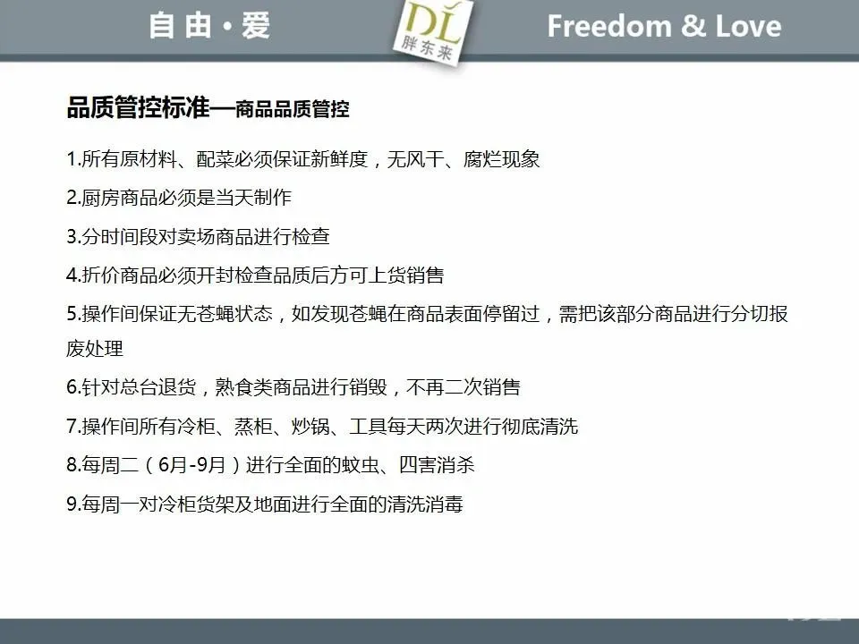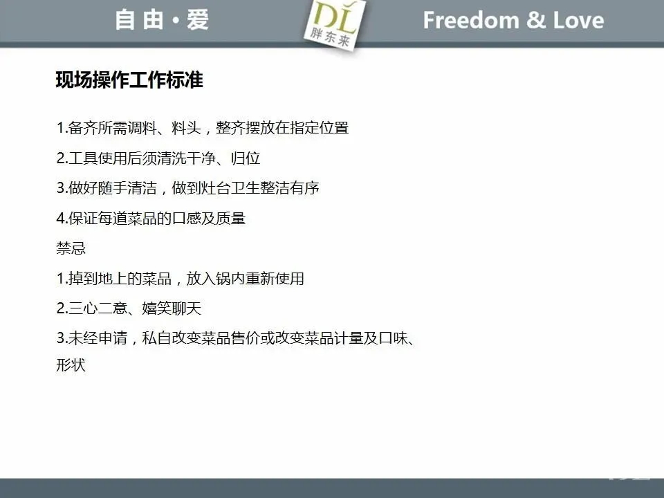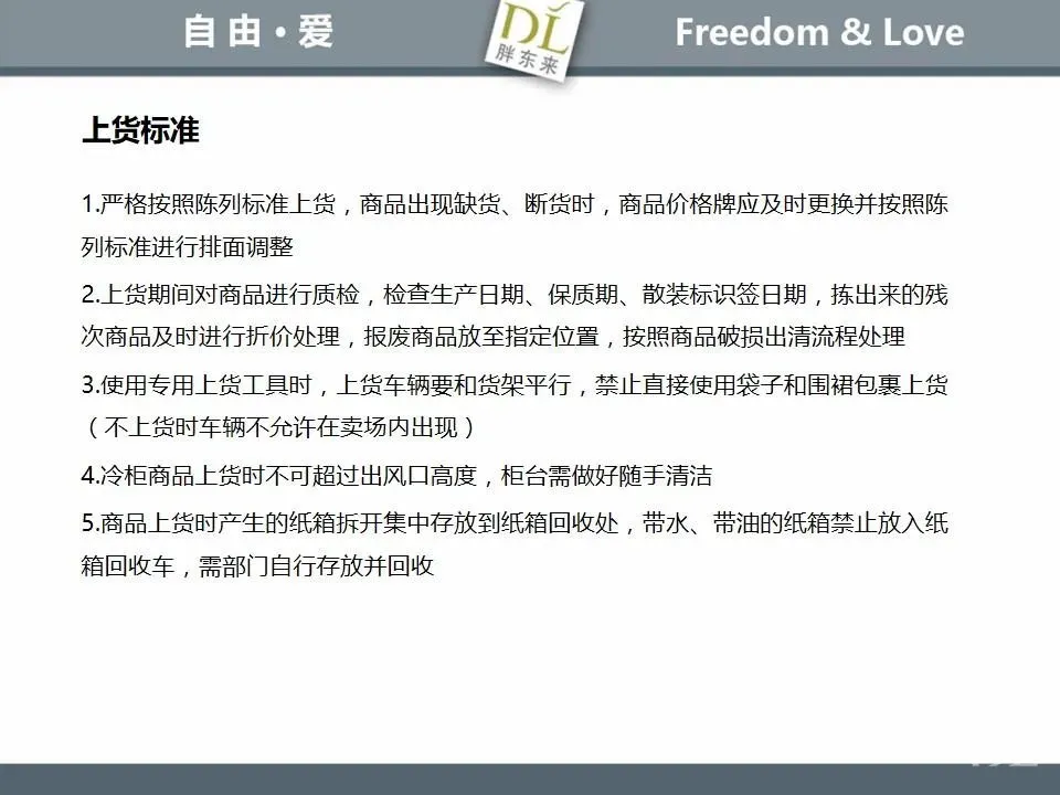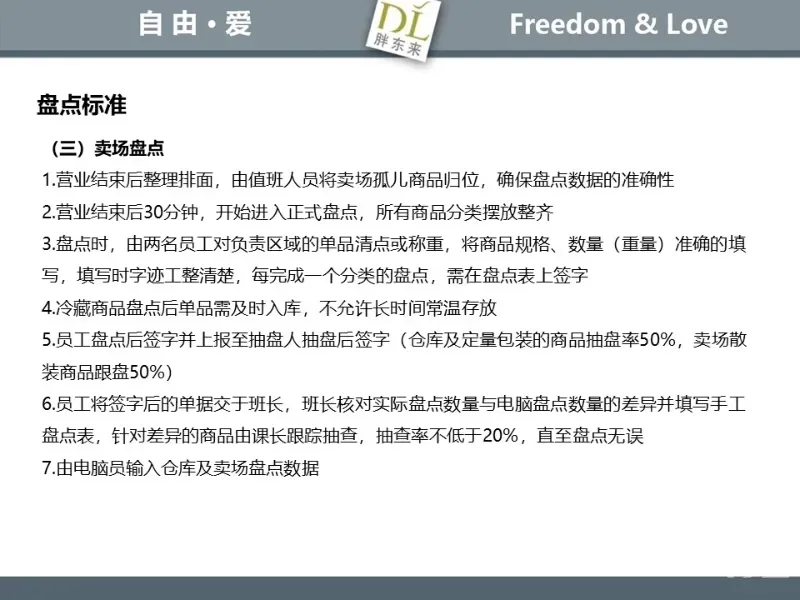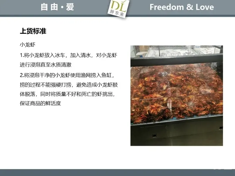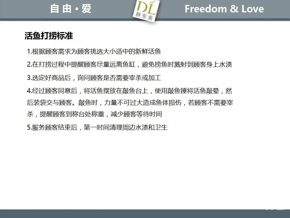 胖东来生鲜营运现场标准内容,将从文将从生鲜营运一天的工作流程包括营业前、营业中和营业后、生鲜的各类标准包括商品管理、防护用品佩戴标准、养殖标准、刀手工作标准、厨师工作标准、交接班标准、设施设备管理标准以及环境标准、卫生标准等多角度分享胖东来生鲜现场的管理培训标准课件。