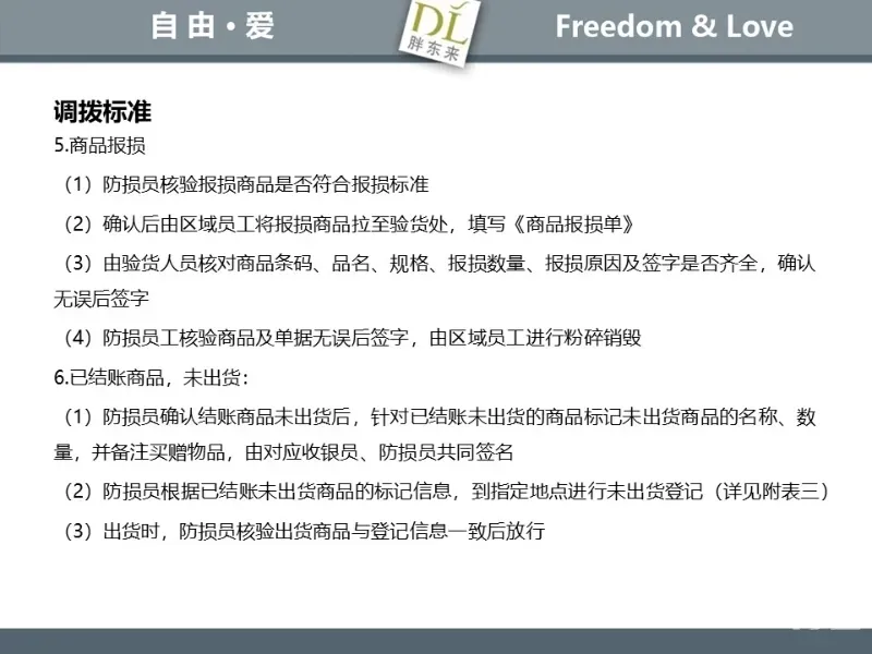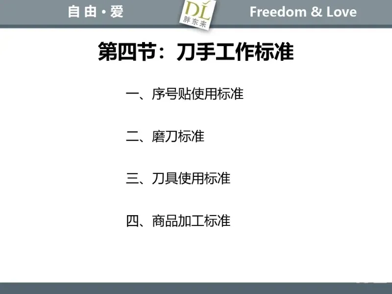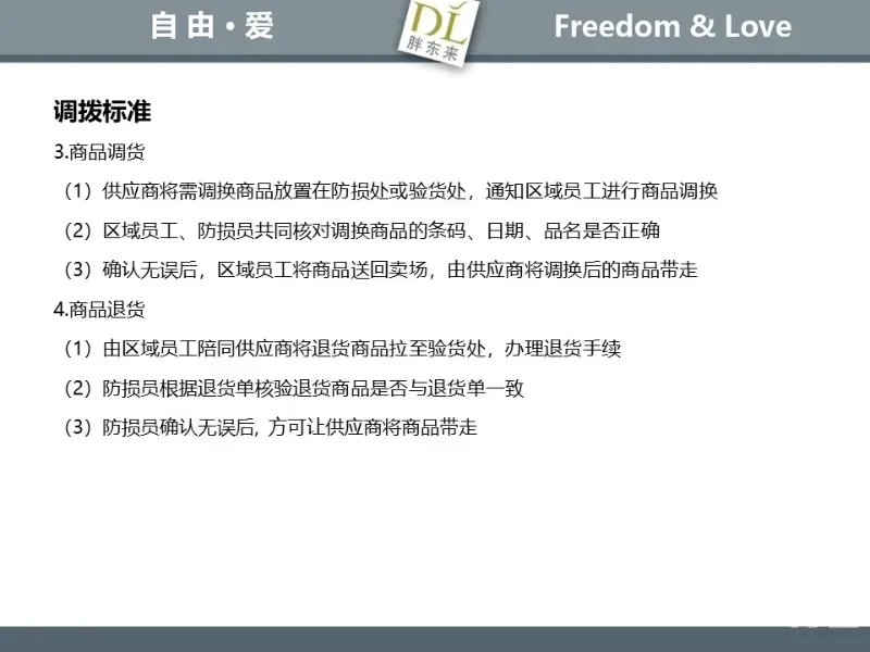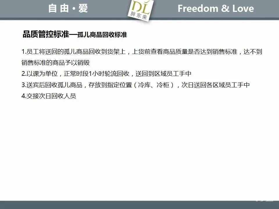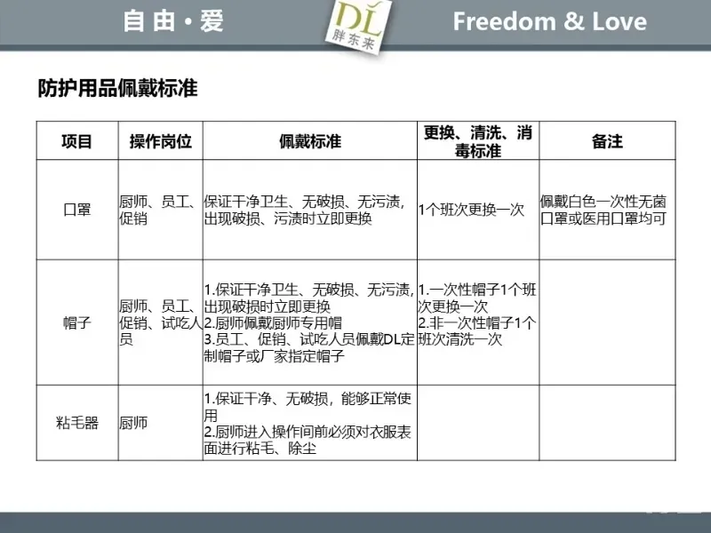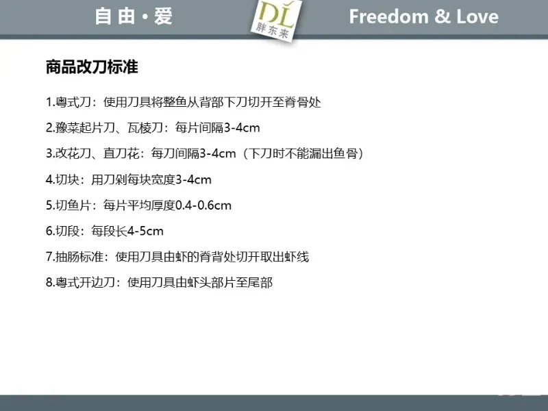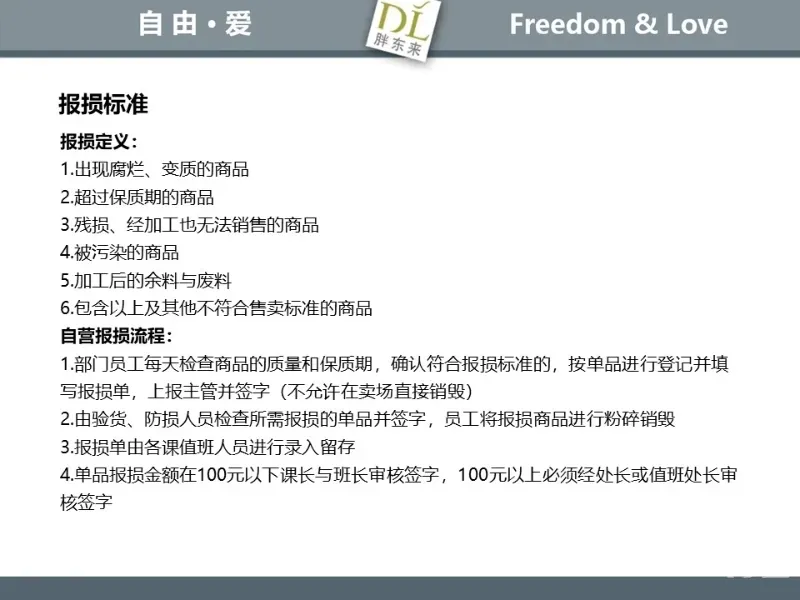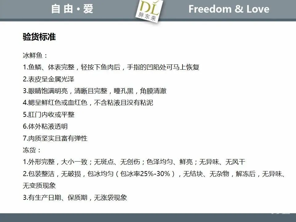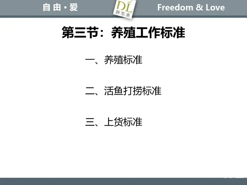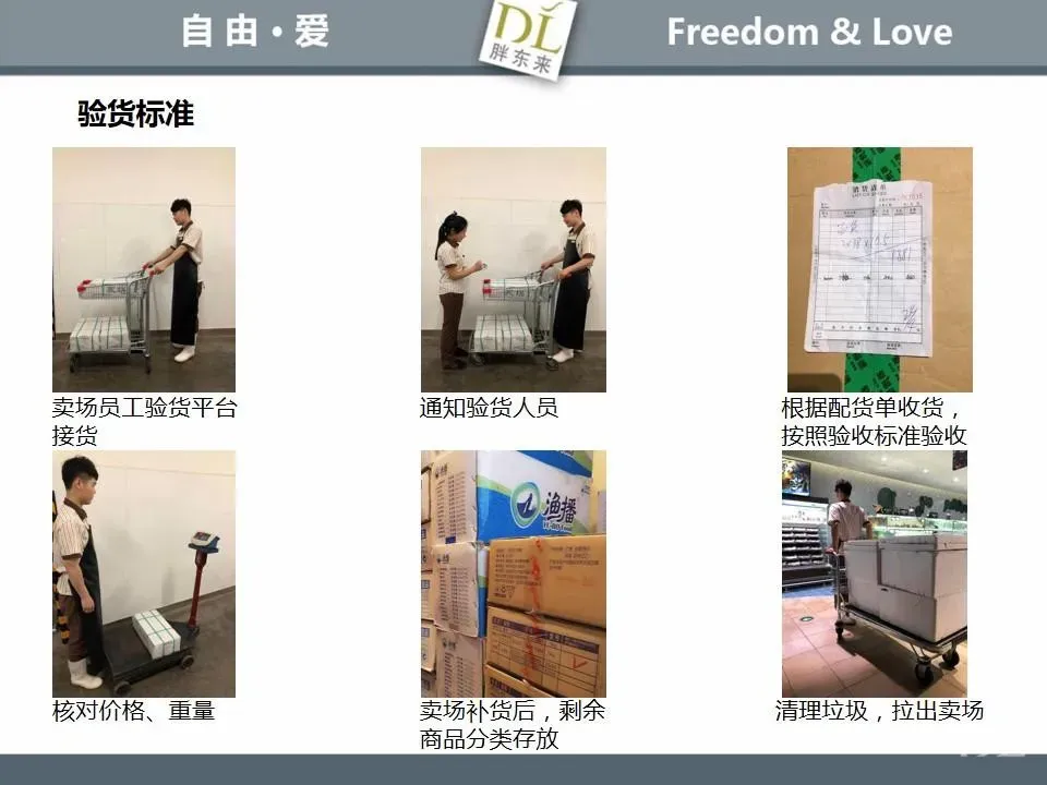 胖东来生鲜营运现场标准内容,将从文将从生鲜营运一天的工作流程包括营业前、营业中和营业后、生鲜的各类标准包括商品管理、防护用品佩戴标准、养殖标准、刀手工作标准、厨师工作标准、交接班标准、设施设备管理标准以及环境标准、卫生标准等多角度分享胖东来生鲜现场的管理培训标准课件。