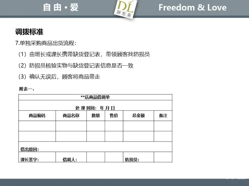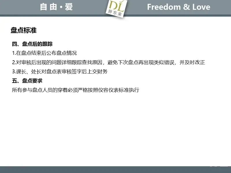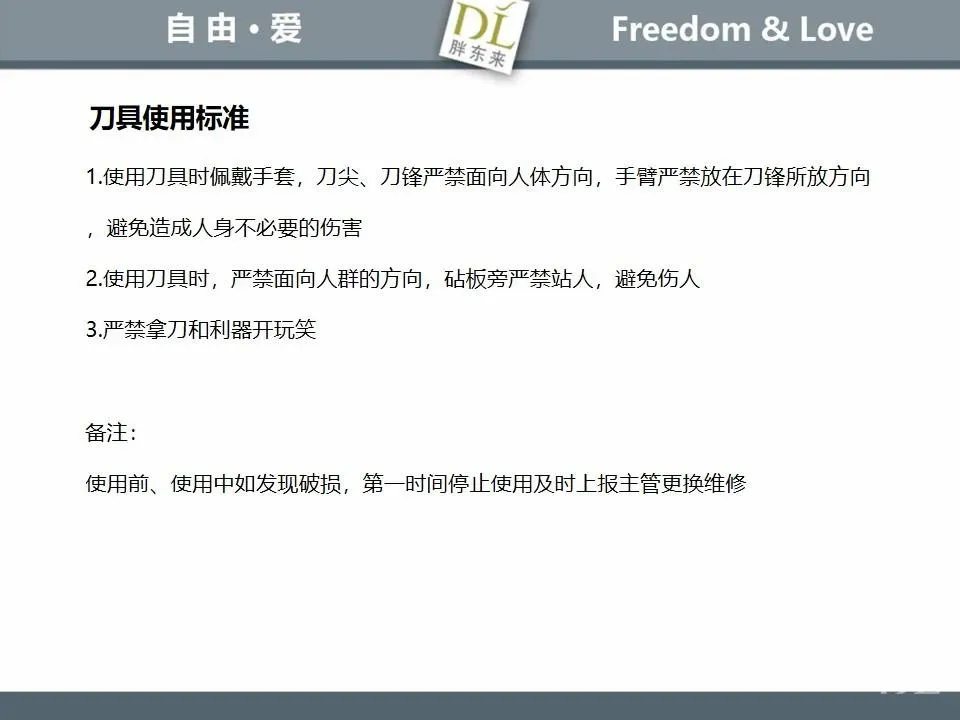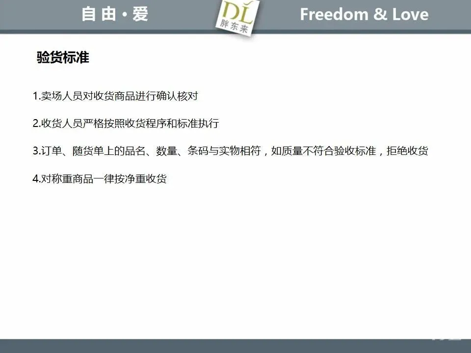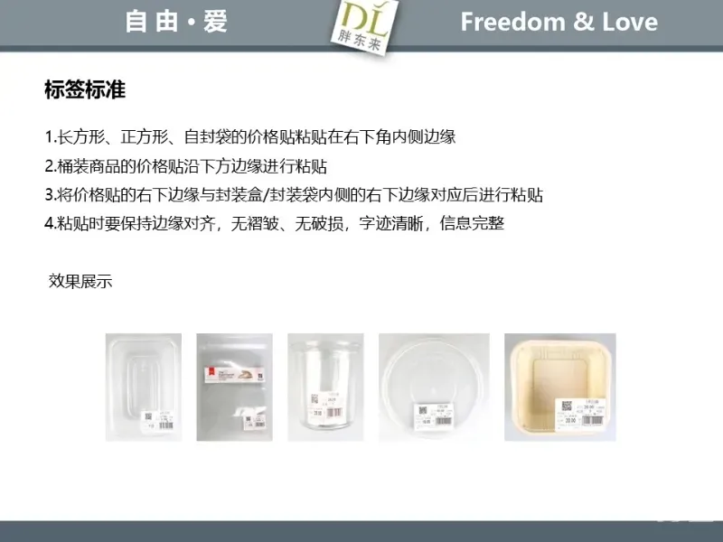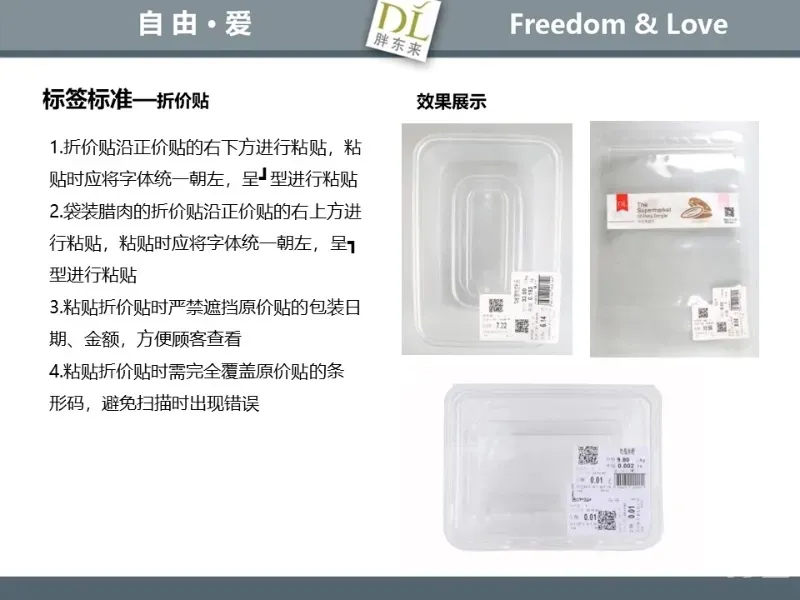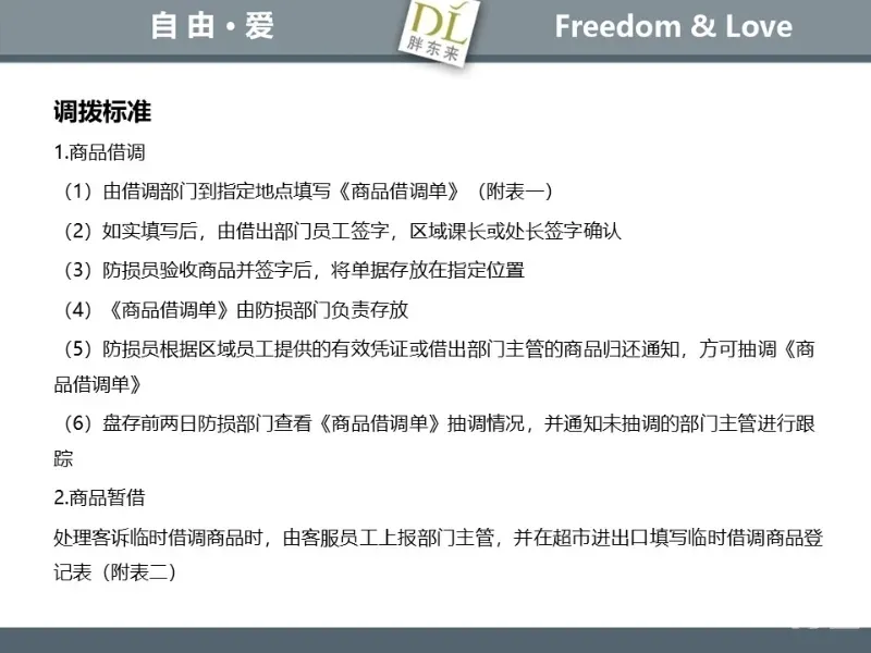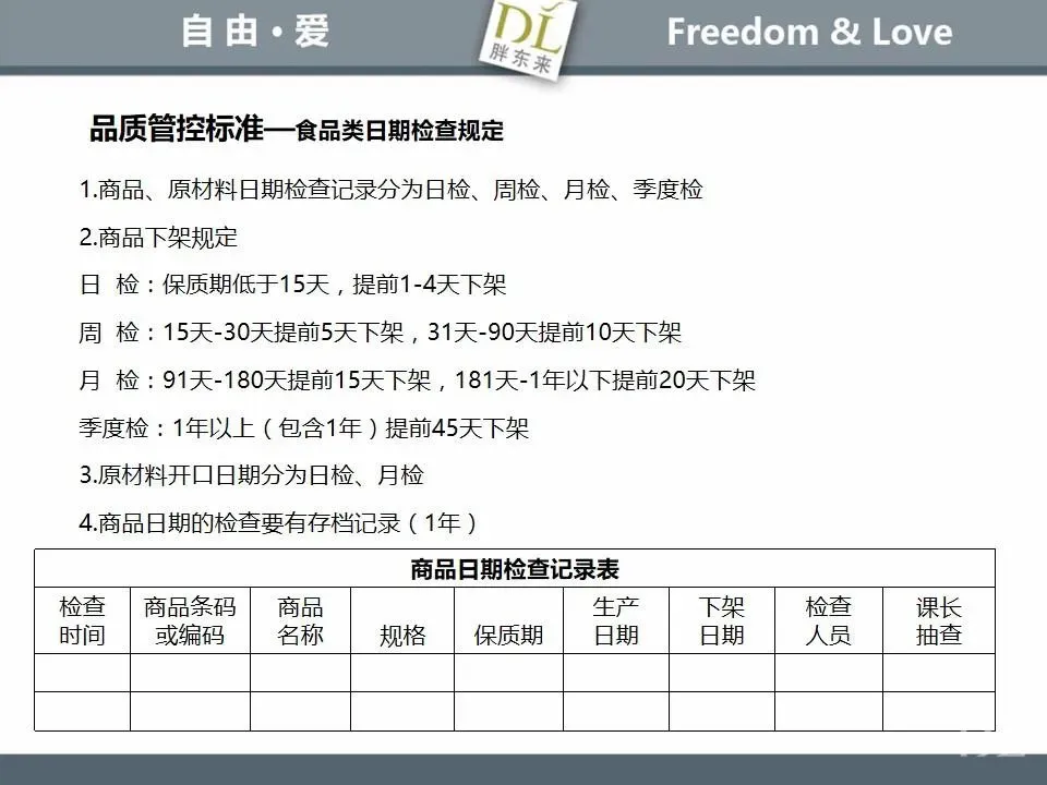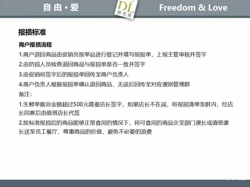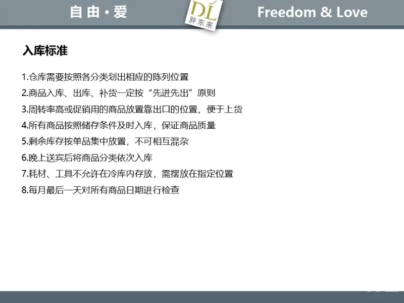 胖东来生鲜营运现场标准内容,将从文将从生鲜营运一天的工作流程包括营业前、营业中和营业后、生鲜的各类标准包括商品管理、防护用品佩戴标准、养殖标准、刀手工作标准、厨师工作标准、交接班标准、设施设备管理标准以及环境标准、卫生标准等多角度分享胖东来生鲜现场的管理培训标准课件。