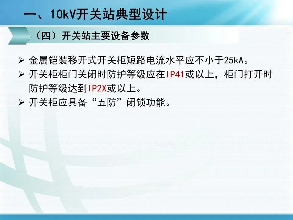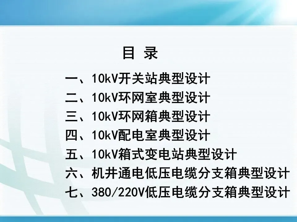 配电网工程典型设计培训:一、10kV开关站典型设计\二、10kV环网室典型设计\三、10kV环网箱典型设计\四、10kV配电室典型设计\五、10kV箱式变电站典型设计\六、机井通电低压电缆分支箱典型设计\七、380/220V低压电缆分支箱典型设计