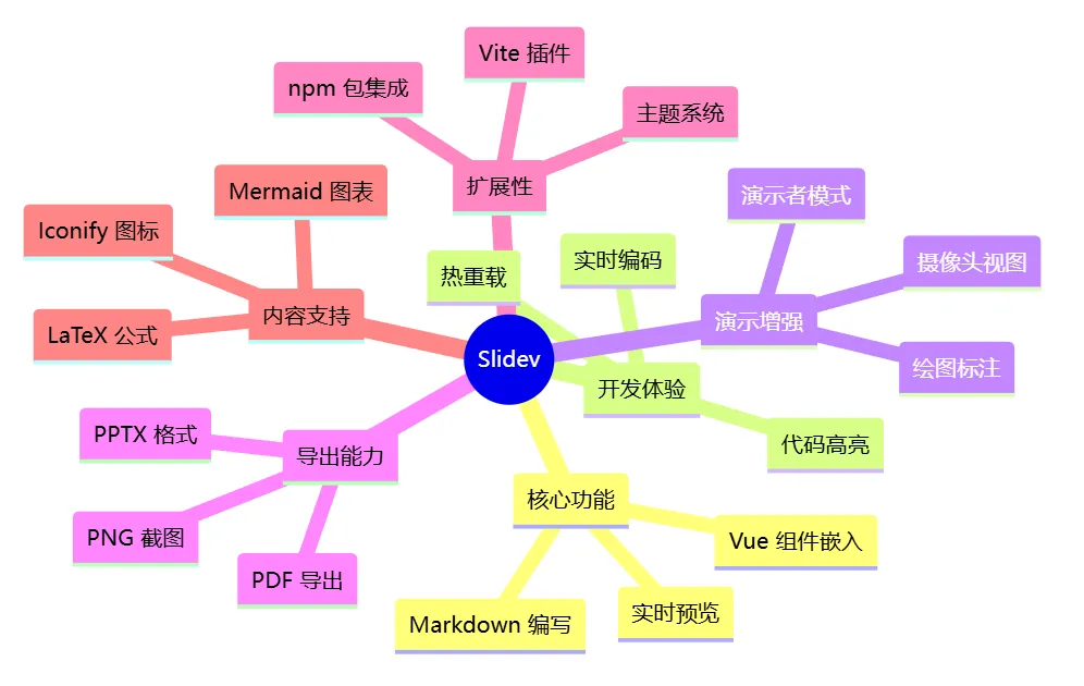 这样的简洁语法,让开发者可以将精力集中在内容创作上,而不是排版。### 🧑‍💻 开发者友好的功能#### 代码高亮与实时编码Slidev 内置了 Shiki 和 Monaco Editor,提供一流的代码片段支持:```mermaidgraph LR    A[代码输入] --> B[Shiki 高亮]    A --> C[Monaco 编辑器]    B --> D[精美展示]    C --> E[实时编辑]    E --> F[代码演示]style A fill:#646cff,color:#fffstyle B fill:#42b883,color:#fffstyle C fill:#42b883,color:#fff
