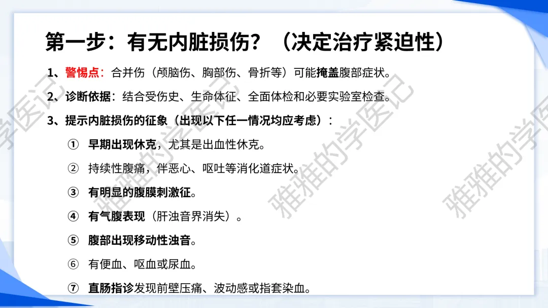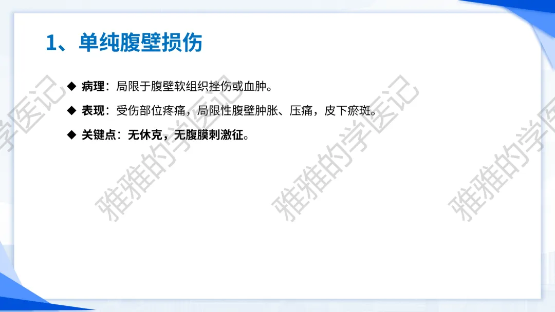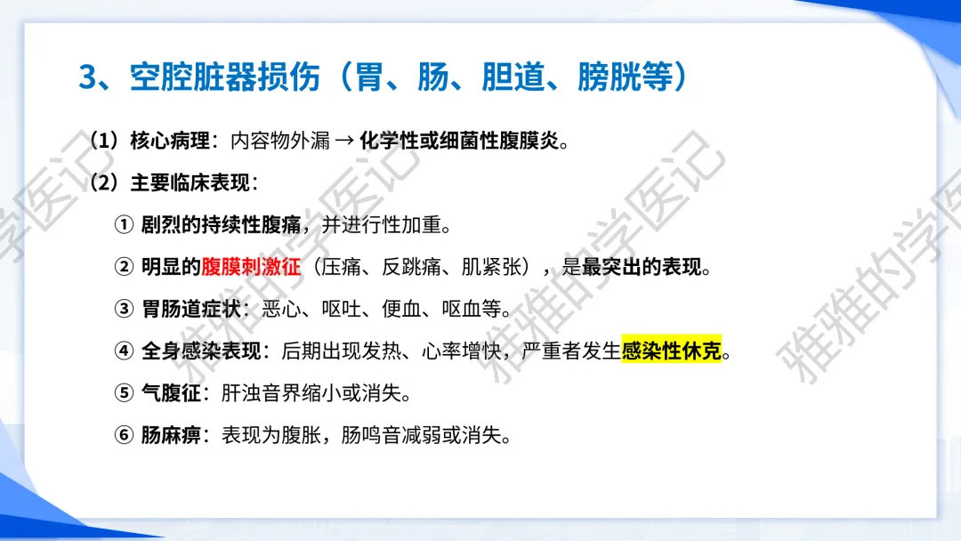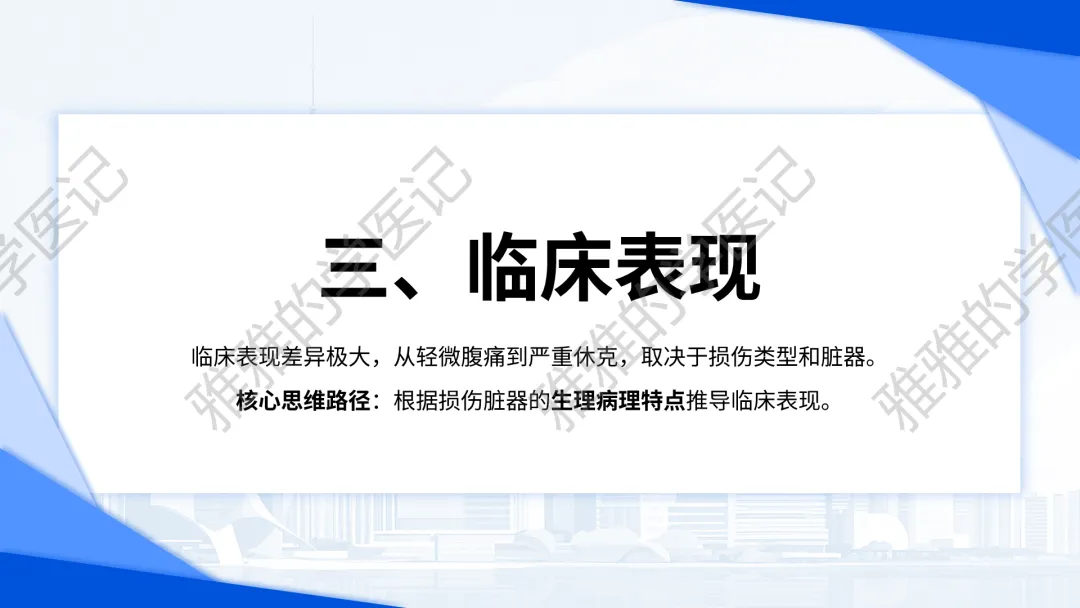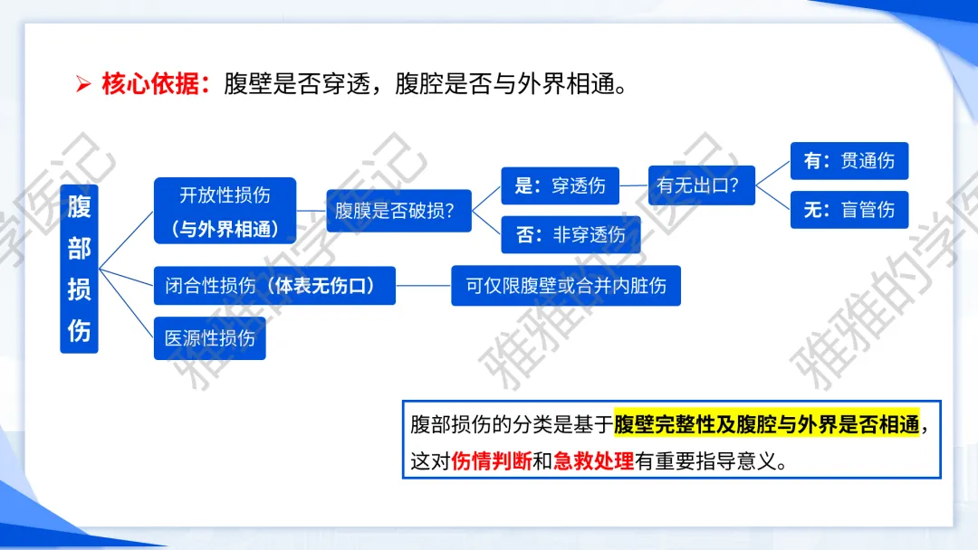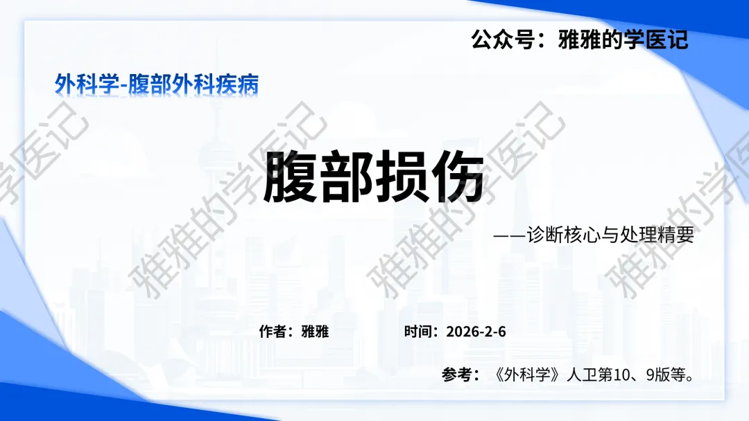 本PPT内容引用自《诊断学(人卫第9、10版)》等权威文献,PPT版权归本公众号所有,制作与审稿均由本公众号完成。关注公众号为“雅雅的学医记”,获取更多专业健康知识。这份PPT凝聚了专业知识与临床经验,对腹部损伤这一症状具有认识,并了解学习的意义,欢迎大家分享转发,共同学习,期待与大家的互动!目前学识有限,欢迎大家的指正。内容说明:腹部损伤,制作完成,目前正在公众号更新,需要笔记版请联系雅雅(免费)。后续更新内容:腹部损伤 · 终极学习指南(应试通关 & 临床实践版)。- 知识点,需要不断积累,并梳理整理为自己的。加油!书山有路勤为径,学海无涯苦作舟。(韩愈)