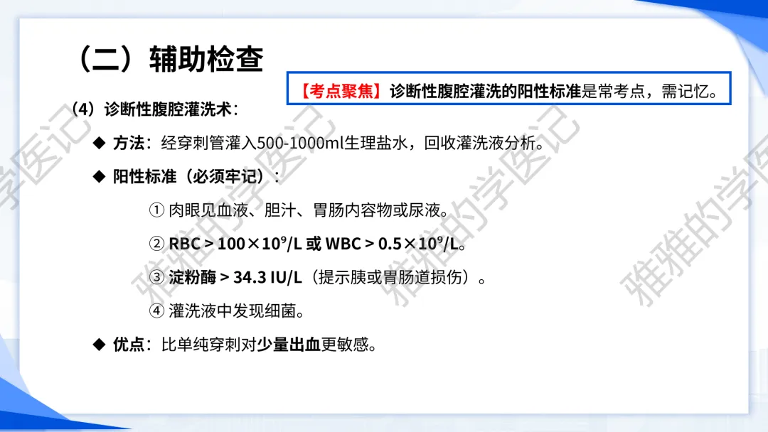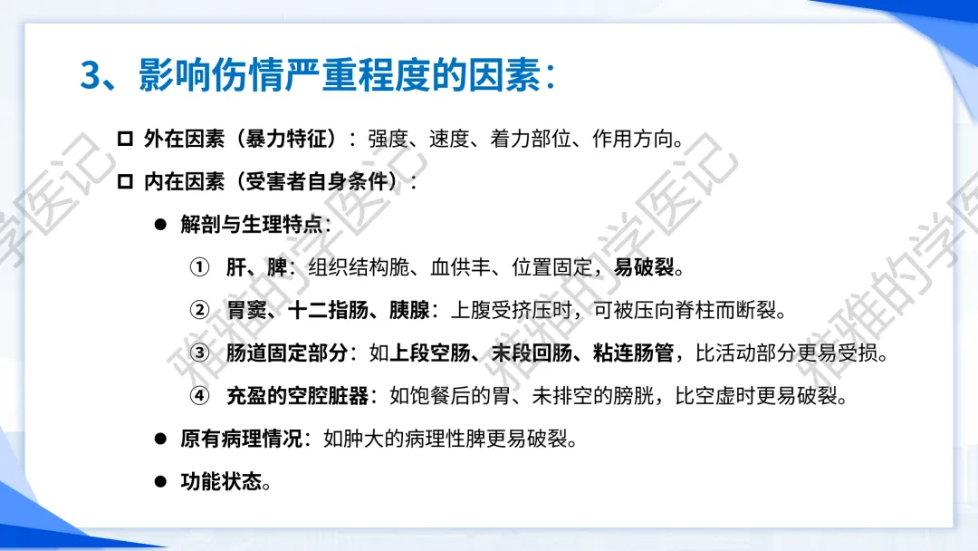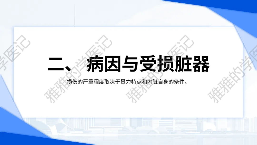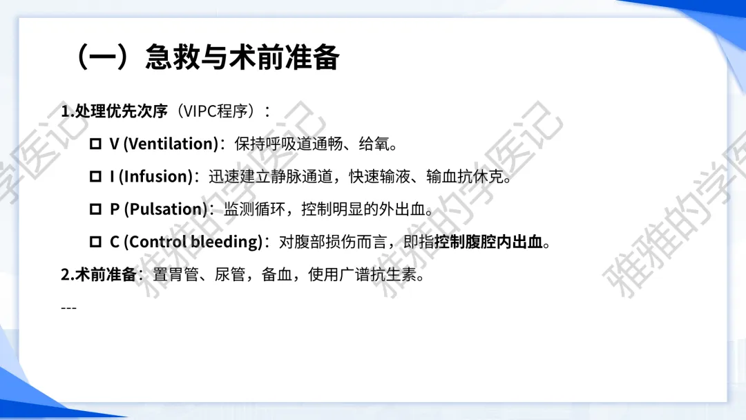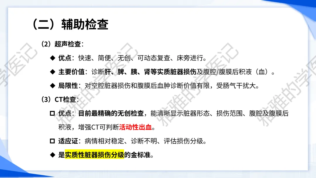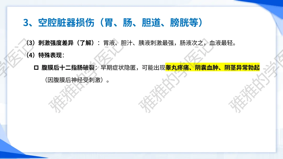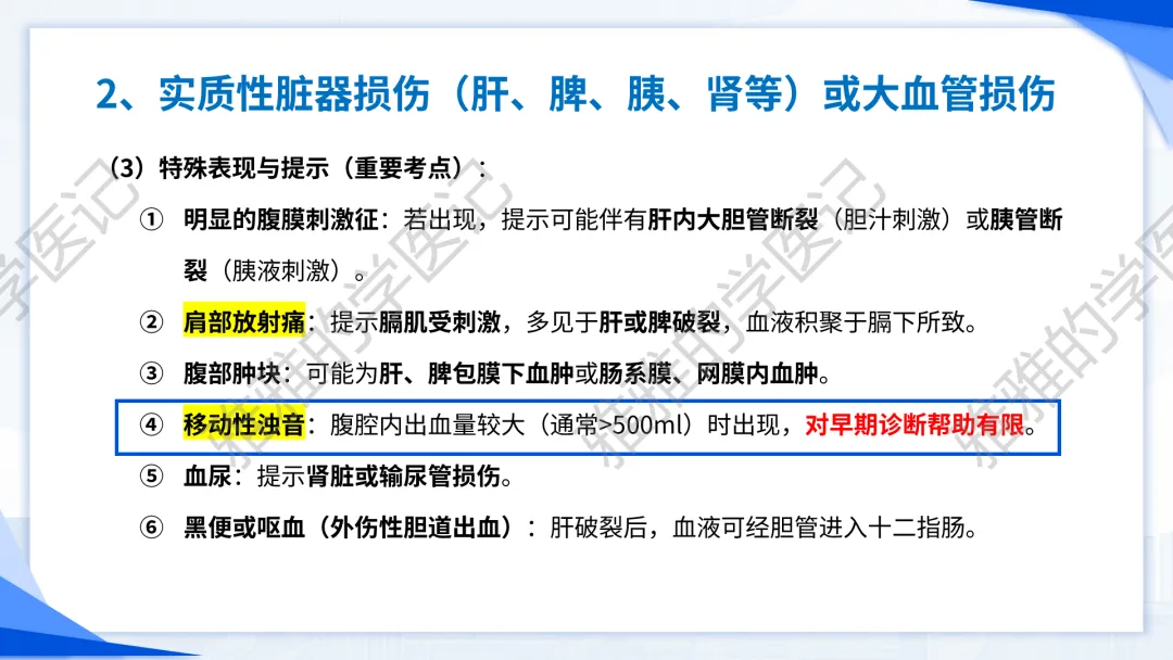 本PPT内容引用自《诊断学(人卫第9、10版)》等权威文献,PPT版权归本公众号所有,制作与审稿均由本公众号完成。关注公众号为“雅雅的学医记”,获取更多专业健康知识。这份PPT凝聚了专业知识与临床经验,对腹部损伤这一症状具有认识,并了解学习的意义,欢迎大家分享转发,共同学习,期待与大家的互动!目前学识有限,欢迎大家的指正。内容说明:腹部损伤,制作完成,目前正在公众号更新,需要笔记版请联系雅雅(免费)。后续更新内容:腹部损伤 · 终极学习指南(应试通关 & 临床实践版)。- 知识点,需要不断积累,并梳理整理为自己的。加油!书山有路勤为径,学海无涯苦作舟。(韩愈)