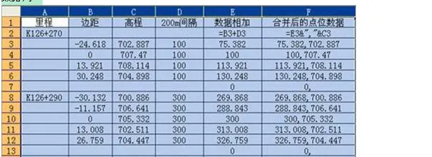 将现场测量数据录入Excel中,数据格式如下表一,其中D列的100,300,500的等差数组,是为了在CAD上能按断面里程从左至右依次画多个断面图。使它们不会出现上一断面的右部与下一断面的左部相交。在E3、F3中先分别输入E2、F2数据并回车后再点击E3、F3,表格亮显后按住右下角的“十”字拖动成了点位数据列。