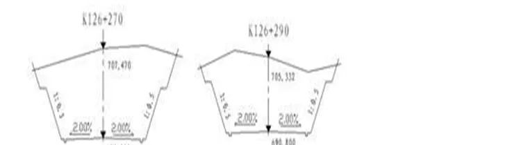根据纵曲线数据计算出K126+270、K126+290、K126+305断面的中桩高程为分别为690.000、690.800、691.400。K126+270断面的标准图形根据点位坐标(100,690.000)在CAD中按照路面横坡往两侧绘制路基线,然后在两侧将边坡线连接在路基的两边。如果后面的断面与本断面也是相同的话,使用CAD中的Copy命令进行复制。方法是在文本窗口中:选择所有线形,回车确认后在“指定基点或位移”时我们将基点选择在(100,690.000),对于后面的“指定位移的第二点或 <用第一点作位移>:”时输入(300,690.800)回车后继续输入(500,691.400)。这样K126+290、K126+305的标准断面就成了。