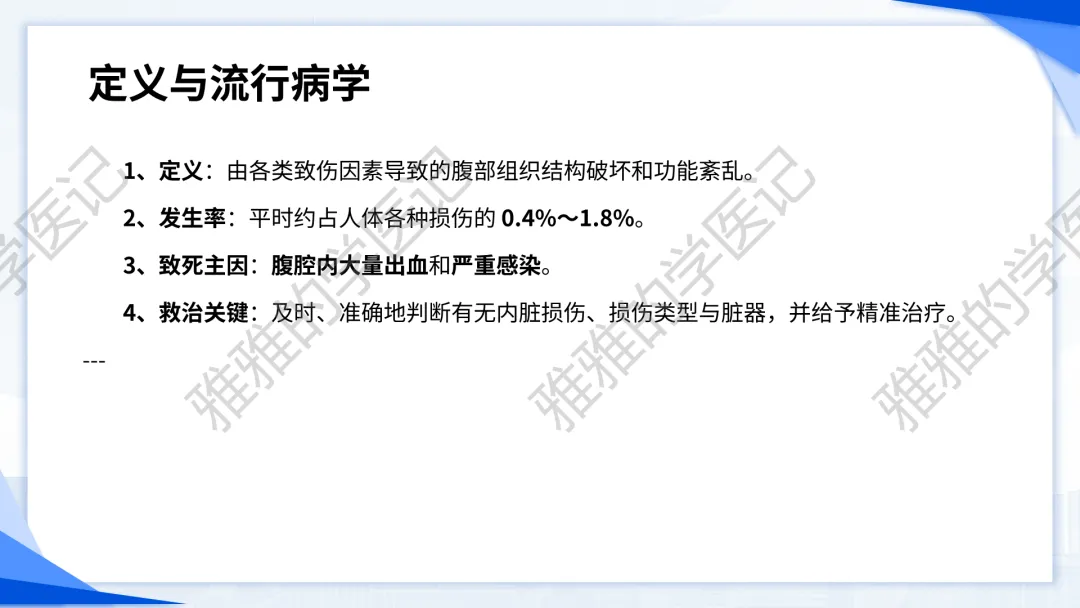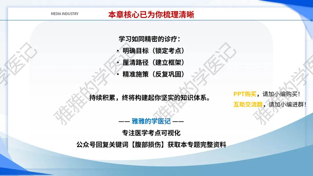 本PPT由本公众号精心制作,全面深入地了解腹部损伤这一重要议题。旨在与大家一同探讨学习,助力提升对腹部外科疾病的认知与实践水平。