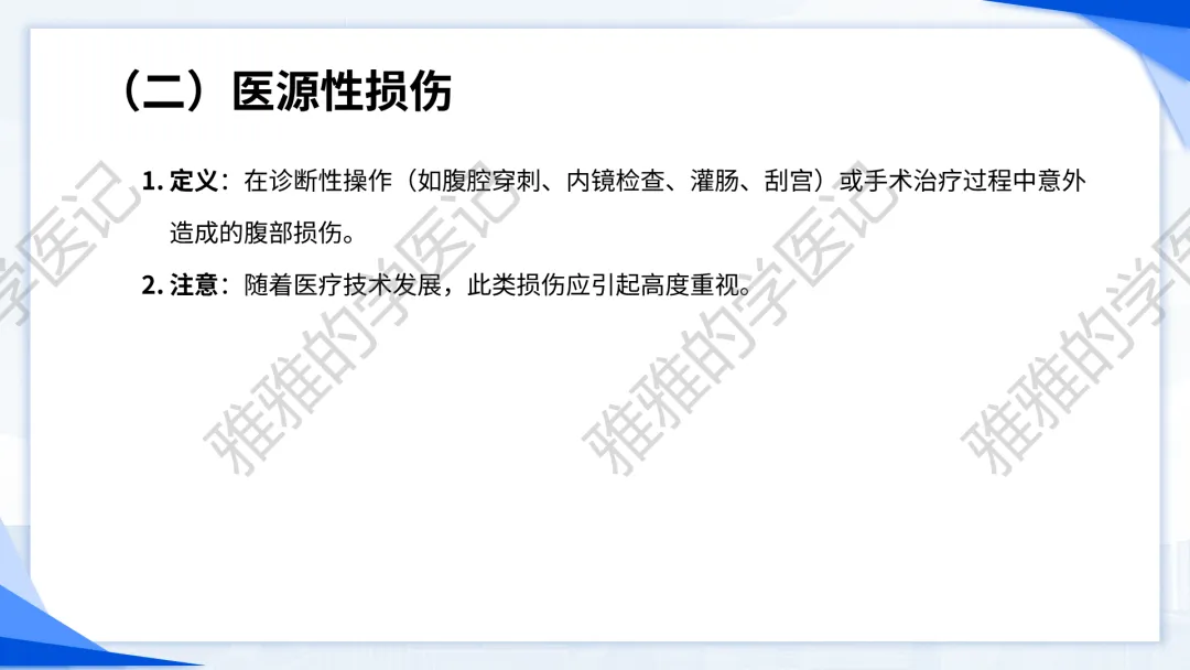 本PPT内容引用自《诊断学(人卫第9、10版)》等权威文献,PPT版权归本公众号所有,制作与审稿均由本公众号完成。关注公众号为“雅雅的学医记”,获取更多专业健康知识。这份PPT凝聚了专业知识与临床经验,对腹部损伤这一症状具有认识,并了解学习的意义,欢迎大家分享转发,共同学习,期待与大家的互动!目前学识有限,欢迎大家的指正。